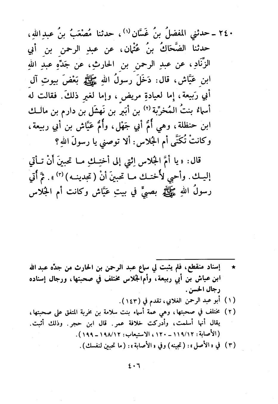 240 - حَدَّثَنِي الْمُفَضَّلُ بْنُ غَسَّانَ، حَدَّثَنَا مُصْعَبُ بْنُ عَبْدِ اللَّهِ، حَدَّثَنَا الضَّحَّاكُ بْنُ عُثْمَانَ، عَنْ عَبْدِ الرَّحْمَنِ بْنِ أَبِي الزِّنَادِ، عَنْ عَبْدِ الرَّحْمَنِ بْنِ الْحَارِثِ، عَنْ جَدِّهِ عَبْدِ اللَّهِ بْنِ عَيَّاشٍ، قَالَ: دَخَلَ رَسُولُ اللَّهِ صَلَّى اللهُ عَلَيْهِ وَسَلَّمَ بَعْضَ بُيُوتِ آلِ أَبِي رَبِيعَةَ إِمَّا لِعِيَادَةِ مَرِيضٍ وَإِمَّا لِغَيْرِ ذَلِكَ فَقَالَتْ لَهُ أَسْمَاءُ بِنْتُ الْمَخْرَبَةِ بْنِ أُبَيْرِ بْنِ نَهْشَلِ بْنِ دَارِمِ بْنِ مَالِكِ بْنِ حَنْظَلَةَ , وَهِيَ أُمُّ أَبِي جَهْلٍ , وَأُمُّ عَيَّاشِ بْنِ أَبِي رَبِيعَةَ , وَكَانَتْ تُكَنَّى أُمَّ الْجُلَاسِ: أَلَا تُوصِينِي يَا رَسُولَ اللَّهِ، قَالَ: «يَا أُمَّ الْجُلَاسِ §ائْتِي إِلَى أُخْتِكِ مَا تُحِبِّينَ أَنْ تَأْتِيَ إِلَيْكِ وَأَحِبِّي لِأُخْتِكِ مَا تُحِبِّينَ أَنْ تَجِدِينَهُ» ثُمَّ أُتِيَ رَسُولُ اللَّهِ صَلَّى اللهُ عَلَيْهِ وَسَلَّمَ بِصَبِيٍّ فِي بَيْتِ عَيَّاشٍ وَكَانَتْ أُمُّ الْجُلَاسِ -[407]- ذَكَرَتْ لِرَسُولِ اللَّهِ صَلَّى اللهُ عَلَيْهِ وَسَلَّمَ مَرَضًا بِالصَّبِيِّ أَوْ عِلَّةً فَجَعَلَ رَسُولُ اللَّهِ صَلَّى اللهُ عَلَيْهِ وَسَلَّمَ يَرْقِي الصَّبِيَّ وَيَتْفُلُ عَلَيْهِ وَجَعَلَ الصَّبِيُّ يَتْفُلُ عَلَى رَسُولِ اللَّهِ صَلَّى اللهُ عَلَيْهِ وَسَلَّمَ فَجَعَلَ بَعْضُ أَهْلِ الْبَيْتِ يَنْتَهِرُ الصَّبِيَّ وَيَكُفُّهُنَّ رَسُولُ اللَّهِ صَلَّى اللهُ عَلَيْهِ وَسَلَّمَ عَنْ ذَلِكَ