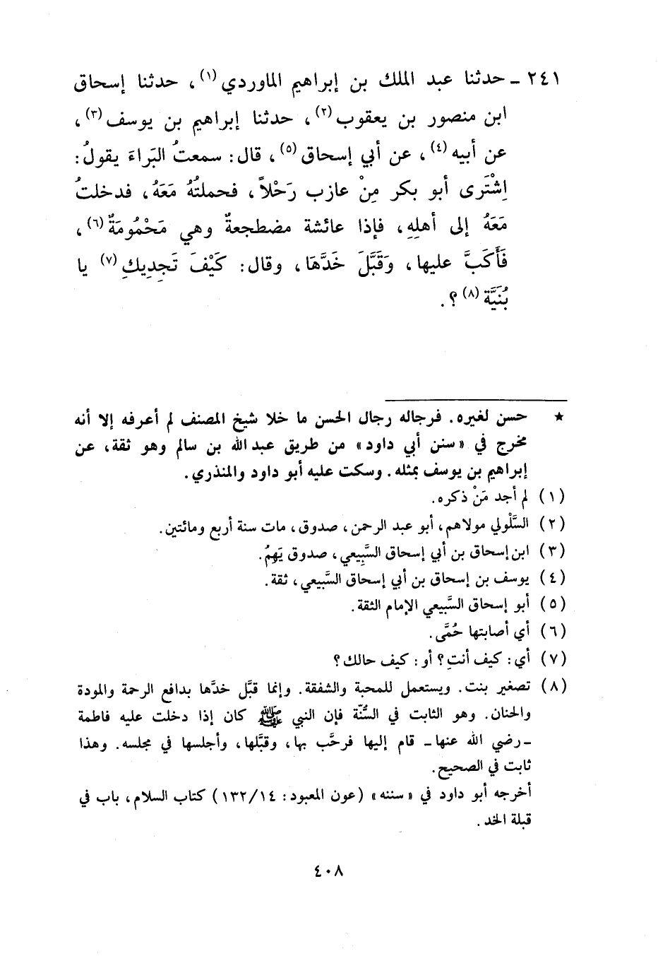 241 - حَدَّثَنَا عَبْدُ الْمَلِكِ بْنُ إِبْرَاهِيمَ الْمَاوَرْدِيُّ، حَدَّثَنَا إِسْحَاقُ بْنُ مَنْصُورِ بْنِ يَعْقُوبَ، حَدَّثَنَا إِبْرَاهِيمُ بْنُ يُوسُفَ، عَنْ أَبِيهِ، عَنْ أَبِي إِسْحَاقَ، قَالَ: سَمِعْتُ الْبَرَاءَ، يَقُولُ: اشْتَرَى أَبُو بَكْرٍ مِنْ عَازِبٍ رَحْلًا فَحَمَلْتُهُ مَعَهُ فَدَخَلْتُ مَعَهُ إِلَى أَهْلِهِ فَإِذَا عَائِشَةُ مُضْطَجِعَةٌ وَهِيَ مَحْمُومَةٌ فَأَكَبَّ عَلَيْهَا وَقَبَّلَ خَدَّهَا وَقَالَ: «§كَيْفَ تَجِدِينَكِ يَا بُنَيَّةُ»