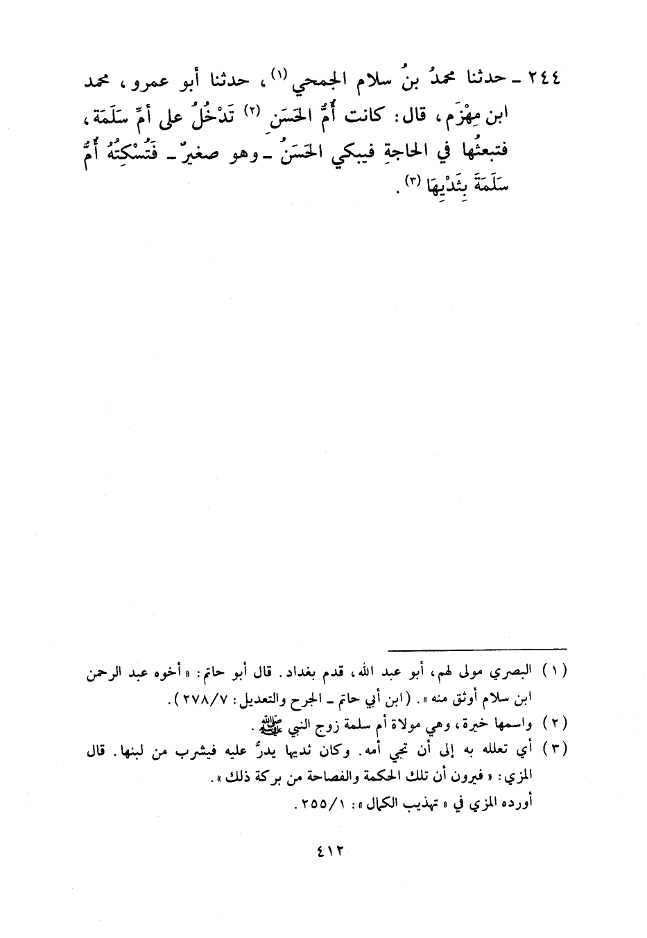 244 - حَدَّثَنَا مُحَمَّدُ بْنُ سَلَامٍ الْجُمَحِيُّ، حَدَّثَنَا أَبُو عَمْرٍو مُحَمَّدُ بْنُ مِهْزَمٍ قَالَ: كَانَتْ أُمُّ الْحَسَنِ تَدْخُلُ عَلَى أُمِّ سَلَمَةَ فَتَبْعَثُهَا فِي الْحَاجَةِ §فَيَبْكِي الْحَسَنُ وَهُوَ صَغِيرٌ فَتُسْكِتُهُ أُمُّ سَلَمَةَ بِثَدْيِهَا