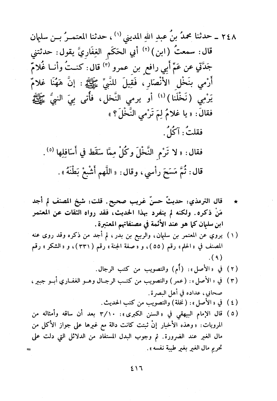248 - حَدَّثَنَا مُحَمَّدُ بْنُ عَبْدِ اللَّهِ الْمَدِينِيُّ، حَدَّثَنَا الْمُعْتَمِرُ بْنُ سُلَيْمَانَ، قَالَ: سَمِعْتُ ابْنَ أَبِي الْحَكَمِ الْغِفَارِيَّ، يَقُولُ: حَدَّثَتْنِي جَدَّتِي، عَنْ عَمِّ أَبِي رَافِعِ بْنِ عَمْرٍو، قَالَ: كُنْتُ وَأَنَا غُلَامٌ أَرْمِي بِنَخْلِ الْأَنْصَارِ فَقِيلَ لِلنَّبِيِّ صَلَّى اللهُ عَلَيْهِ وَسَلَّمَ إِنَّ هَاهُنَا غُلَامًا يَرْمِي نَخْلَنَا أَوْ يَرْمِي النَّخْلَ فَأُتِيَ بِيَ النَّبِيُّ صَلَّى اللهُ عَلَيْهِ وَسَلَّمَ فَقَالَ: «يَا غُلَامُ لِمَ تَرْمِي النَّخْلَ؟» فَقُلْتُ: آكُلُ فَقَالَ: «§لَا تَرْمِ النَّخْلَ وَكُلْ مِمَّا سَقَطَ فِي أَسَافِلِهَا» قَالَ: ثُمَّ مَسَحَ رَأْسِي وَقَالَ: «اللَّهُمَّ أَشْبِعْ بَطْنَهُ»