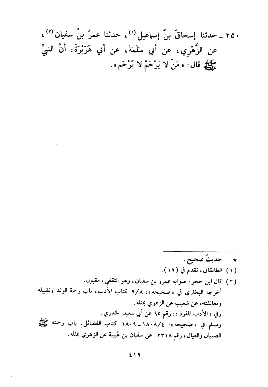 250 - حَدَّثَنَا إِسْحَاقُ بْنُ إِسْمَاعِيلَ، حَدَّثَنَا سُفْيَانُ، عَنِ الزُّهْرِيِّ، عَنْ أَبِي سَلَمَةَ، عَنْ أَبِي هُرَيْرَةَ، أَنَّ النَّبِيَّ صَلَّى اللهُ عَلَيْهِ وَسَلَّمَ قَالَ: «§مَنْ لَا يَرْحَمُ لَا يُرْحَمُ»