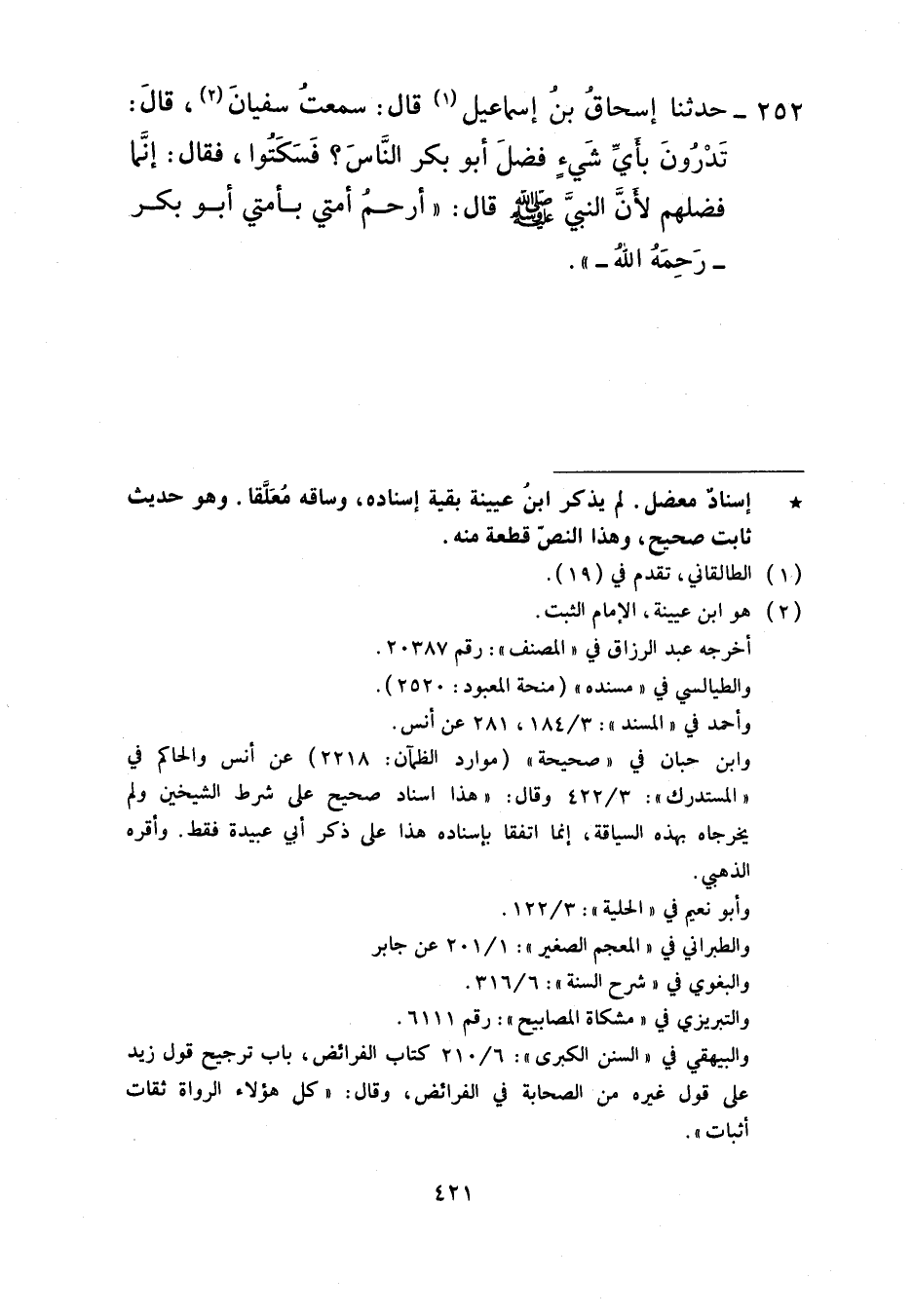 252 - حَدَّثَنَا إِسْحَاقُ بْنُ إِسْمَاعِيلَ، قَالَ: سَمِعْتُ سُفْيَانَ، قَالَ: تَدْرُونَ بِأَيِّ شَيْءٍ فَضَلَ أَبُو بَكْرٍ النَّاسَ؟ فَسَكَتُوا فَقَالَ: إِنَّمَا فَضَلَهُمْ لِأَنَّ النَّبِيَّ صَلَّى اللهُ عَلَيْهِ وَسَلَّمَ قَالَ: «§أَرْحَمُ أُمَّتِي بِأُمَّتِي أَبُو بَكْرٍ رَحِمَهُ اللَّهُ»
