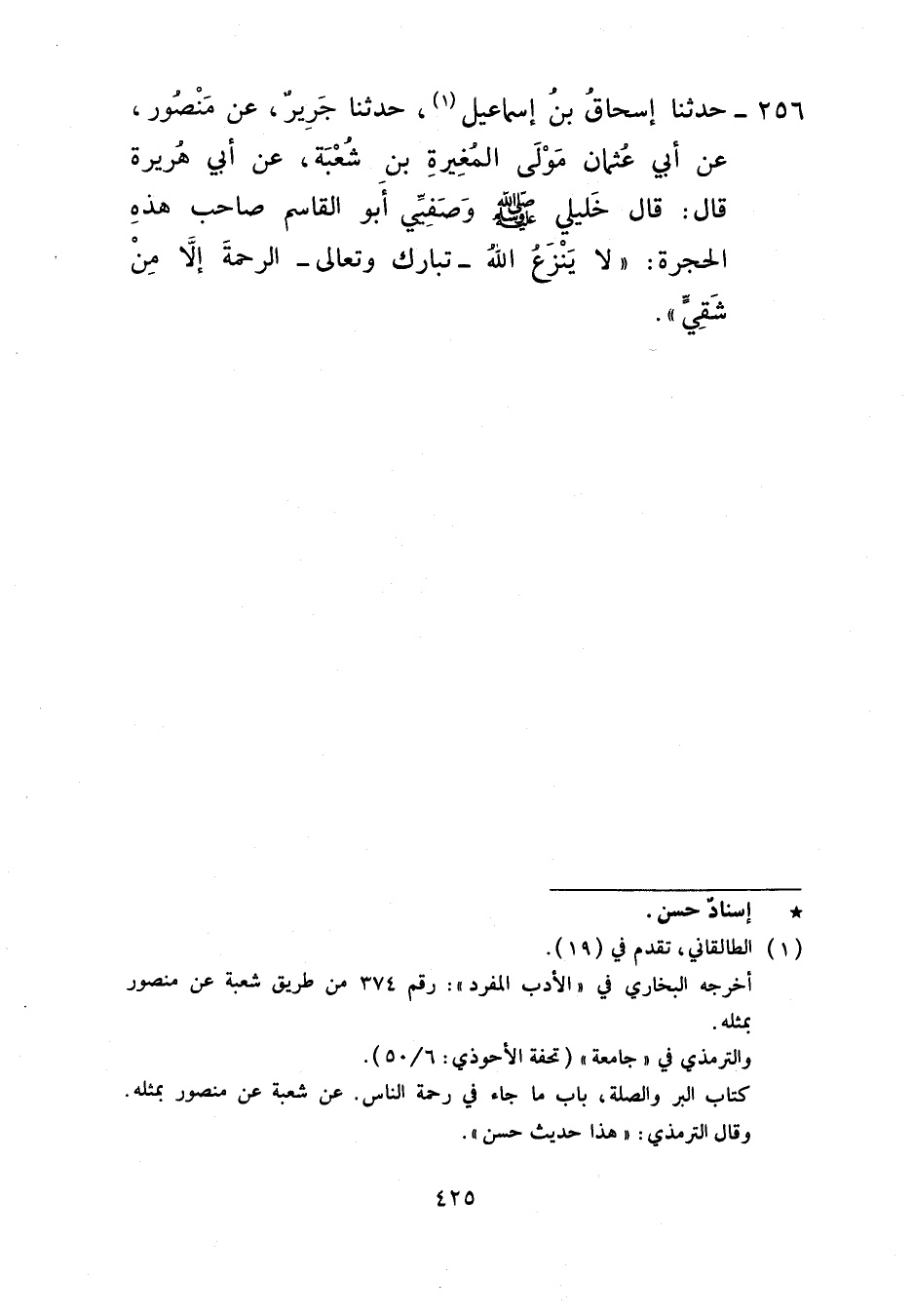 256 - حَدَّثَنَا إِسْحَاقُ بْنُ إِسْمَاعِيلَ، حَدَّثَنَا جَرِيرٌ، عَنْ مَنْصُورٍ، عَنْ أَبِي عُثْمَانَ مَوْلَى الْمُغِيرَةِ بْنِ شُعْبَةَ، عَنْ أَبِي هُرَيْرَةَ، قَالَ: قَالَ خَلِيلِي صَلَّى اللهُ عَلَيْهِ وَسَلَّمَ وَصَفِيِّي أَبُو الْقَاسِمِ صَاحِبُ هَذِهِ الْحُجْرَةِ: «§لَا يَنْزِعُ اللَّهُ تَبَارَكَ وَتَعَالَى الرَّحْمَةَ إِلَّا مِنْ شَقِيٍّ»