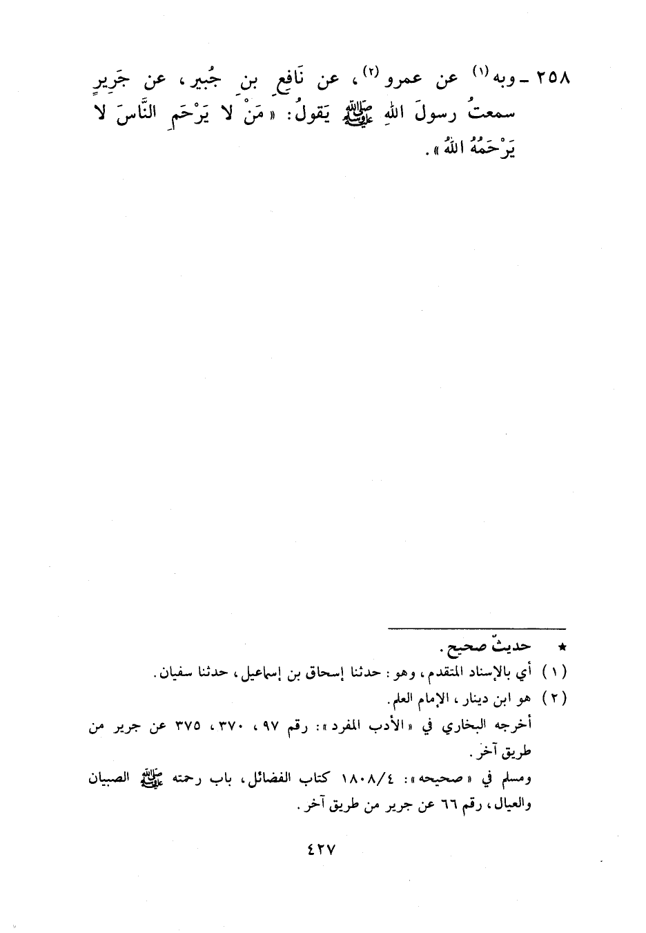 258 - وَبِهِ عَنْ عَمْرٍو، عَنْ نَافِعِ بْنِ جُبَيْرٍ، عَنْ جَرِيرٍ، سَمِعْتُ رَسُولَ اللَّهِ صَلَّى اللهُ عَلَيْهِ وَسَلَّمَ يَقُولُ: «§مَنْ لَا يَرْحَمُ النَّاسَ لَا يَرْحَمُهُ اللَّهُ»