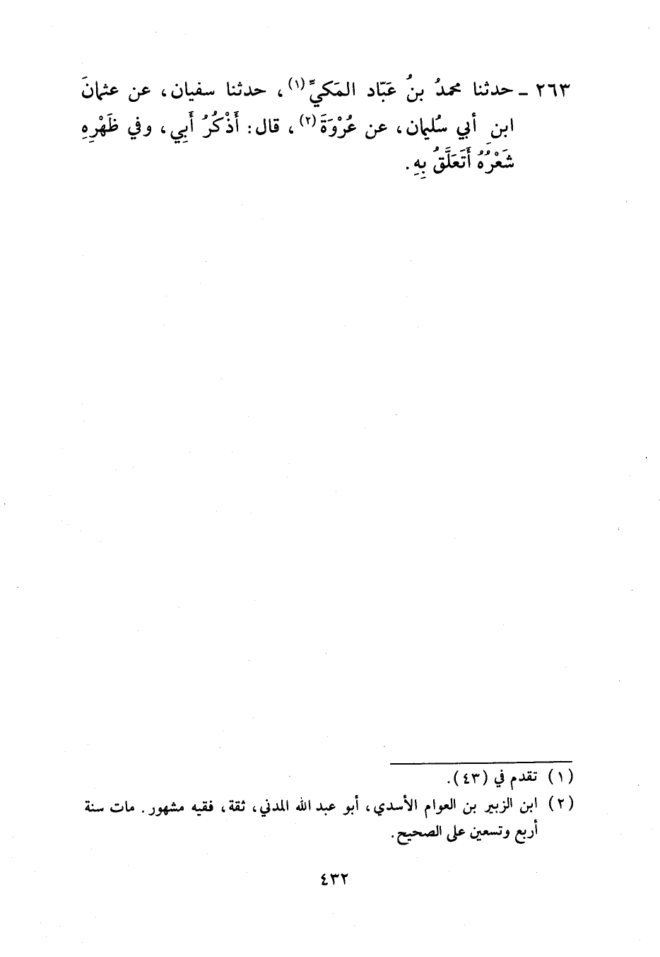 263 - حَدَّثَنَا مُحَمَّدُ بْنُ عَبَّادٍ الْمَكِّيُّ، حَدَّثَنَا سُفْيَانُ، عَنْ عُثْمَانَ بْنِ أَبِي سُلَيْمَانَ، عَنْ عُرْوَةَ، قَالَ: «§أَذْكُرُ أَبِي وَفِي ظَهْرِهِ شَعْرُهُ أَتَعَلَّقُ بِهِ»