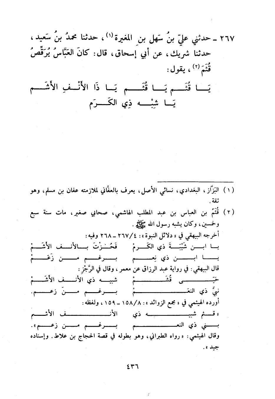 267 - حَدَّثَنِي عَلِيُّ بْنُ سَهْلِ بْنِ الْمُغِيرَةِ، حَدَّثَنَا مُحَمَّدُ بْنُ سَعِيدٍ، حَدَّثَنَا شَرِيكٌ، عَنْ أَبِي إِسْحَاقَ، قَالَ: كَانَ الْعَبَّاسُ يُرَقِّصُ قُثَمًا يَقُولُ: «