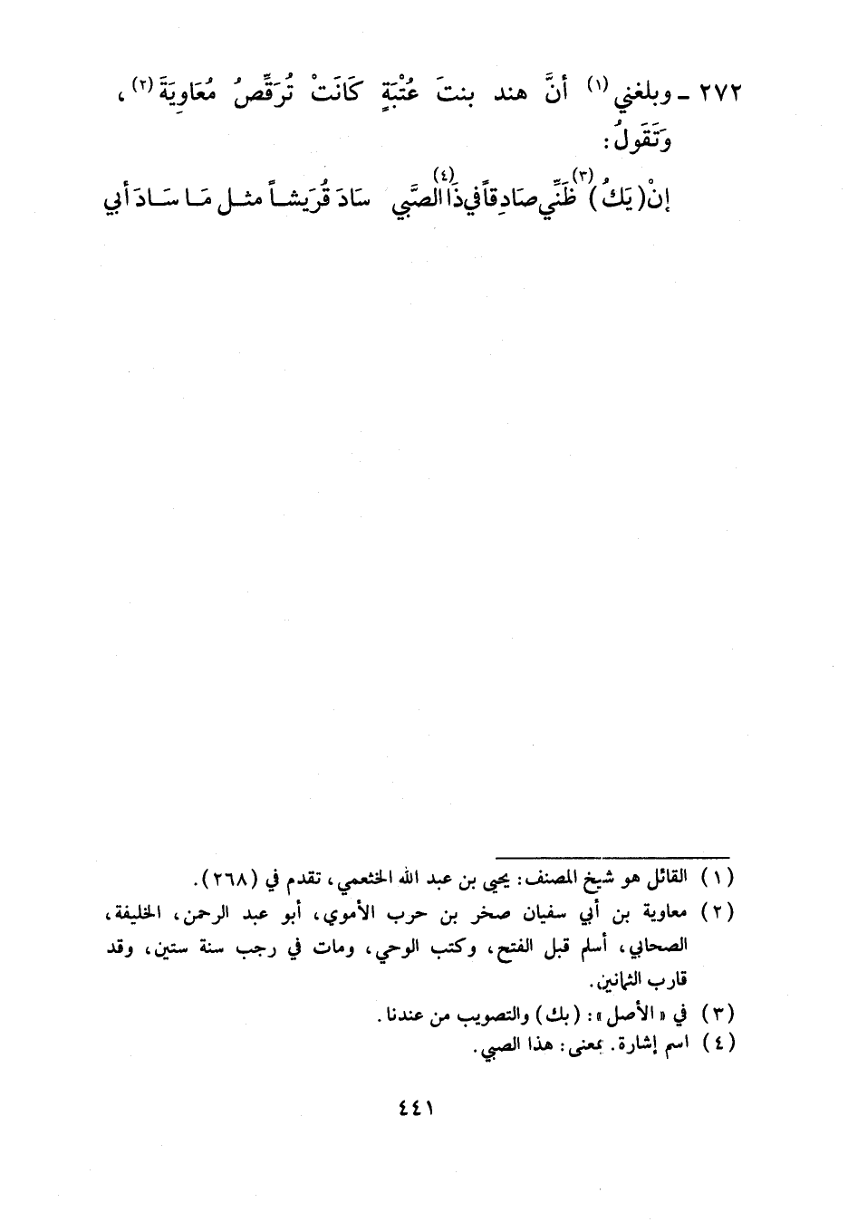 272 - وَبَلَغَنِي أَنَّ هِنْدَ بِنْتَ عُتْبَةَ كَانَتْ تُرْقِصُ مُعَاوِيَةَ وَتَقُولُ: