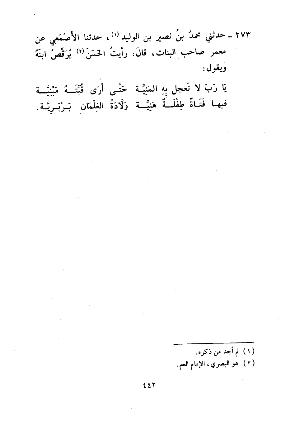 273 - حَدَّثَنِي مُحَمَّدُ بْنُ نُصَيْرِ بْنِ الْوَلِيدِ، حَدَّثَنَا الْأَصْمَعِيُّ، عَنْ مَعْمَرٍ صَاحِبِ الْبَنَاتِ قَالَ: رَأَيْتُ الْحَسَنَ يُرَقِّصُ ابْنَهُ وَيَقُولُ: «