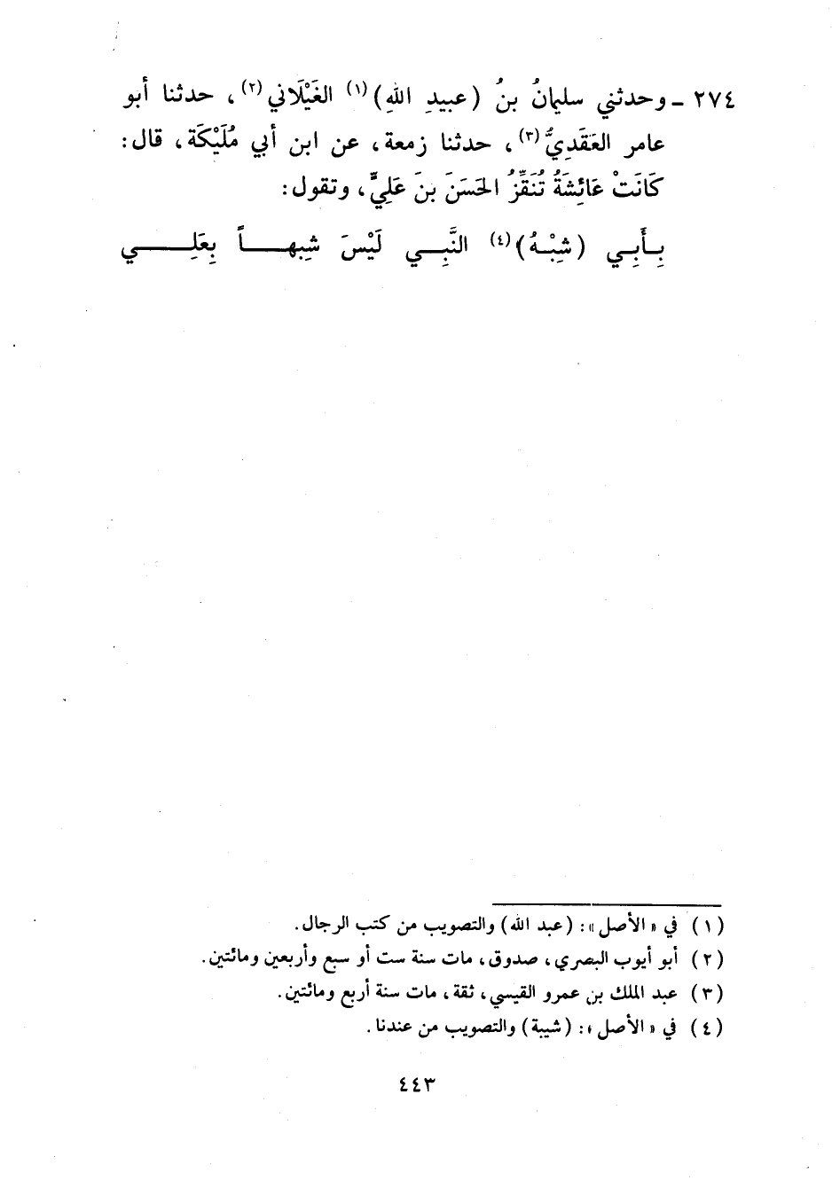 274 - وَحَدَّثَنِي سُلَيْمَانُ بْنُ عُبَيْدِ اللَّهِ الْغَيْلَانِيُّ، حَدَّثَنَا أَبُو عَامِرٍ الْعَقَدِيُّ، حَدَّثَنَا زَمْعَةُ، عَنِ ابْنِ أَبِي مُلَيْكَةَ، قَالَ: كَانَتْ عَائِشَةُ تُنَقِّزُ الْحَسَنَ بْنَ عَلِيٍّ وَتَقُولُ: