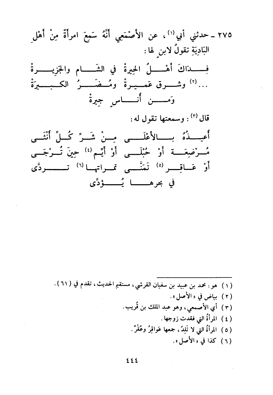 275 - حَدَّثَنِي أَبِي، عَنِ الْأَصْمَعِيِّ، أَنَّهُ سَمِعَ امْرَأَةً مِنْ أَهْلِ الْبَادِيَةِ تَقُولُ لِابْنٍ لَهَا: