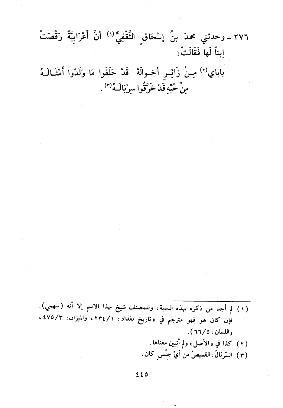 276 - وَحَدَّثَنِي مُحَمَّدُ بْنُ إِسْحَاقَ الثَّقَفِيُّ، أَنَّ أَعْرَابِيَّةً رَقَّصَتِ ابْنًا لَهَا فَقَالَتْ: