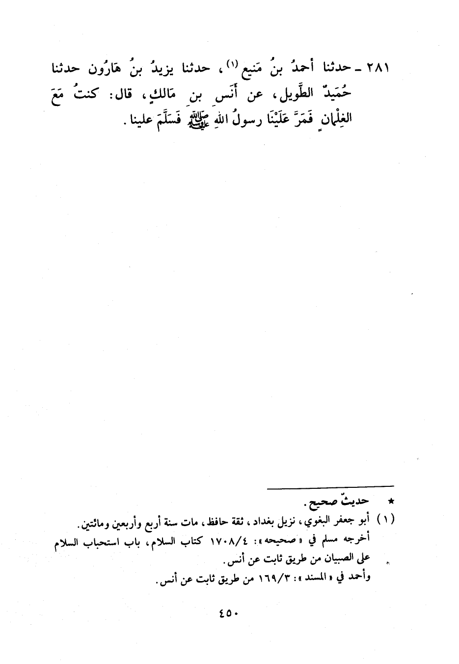 281 - حَدَّثَنَا أَحْمَدُ بْنُ مَنِيعٍ، حَدَّثَنَا يَزِيدُ بْنُ هَارُونَ، حَدَّثَنَا حُمَيْدٌ الطَّوِيلُ، عَنْ أَنَسِ بْنِ مَالِكٍ، قَالَ: §كُنْتُ مَعَ الْغِلْمَانِ فَمَرَّ عَلَيْنَا رَسُولُ اللَّهِ صَلَّى اللهُ عَلَيْهِ وَسَلَّمَ فَسَلَّمَ عَلَيْنَا