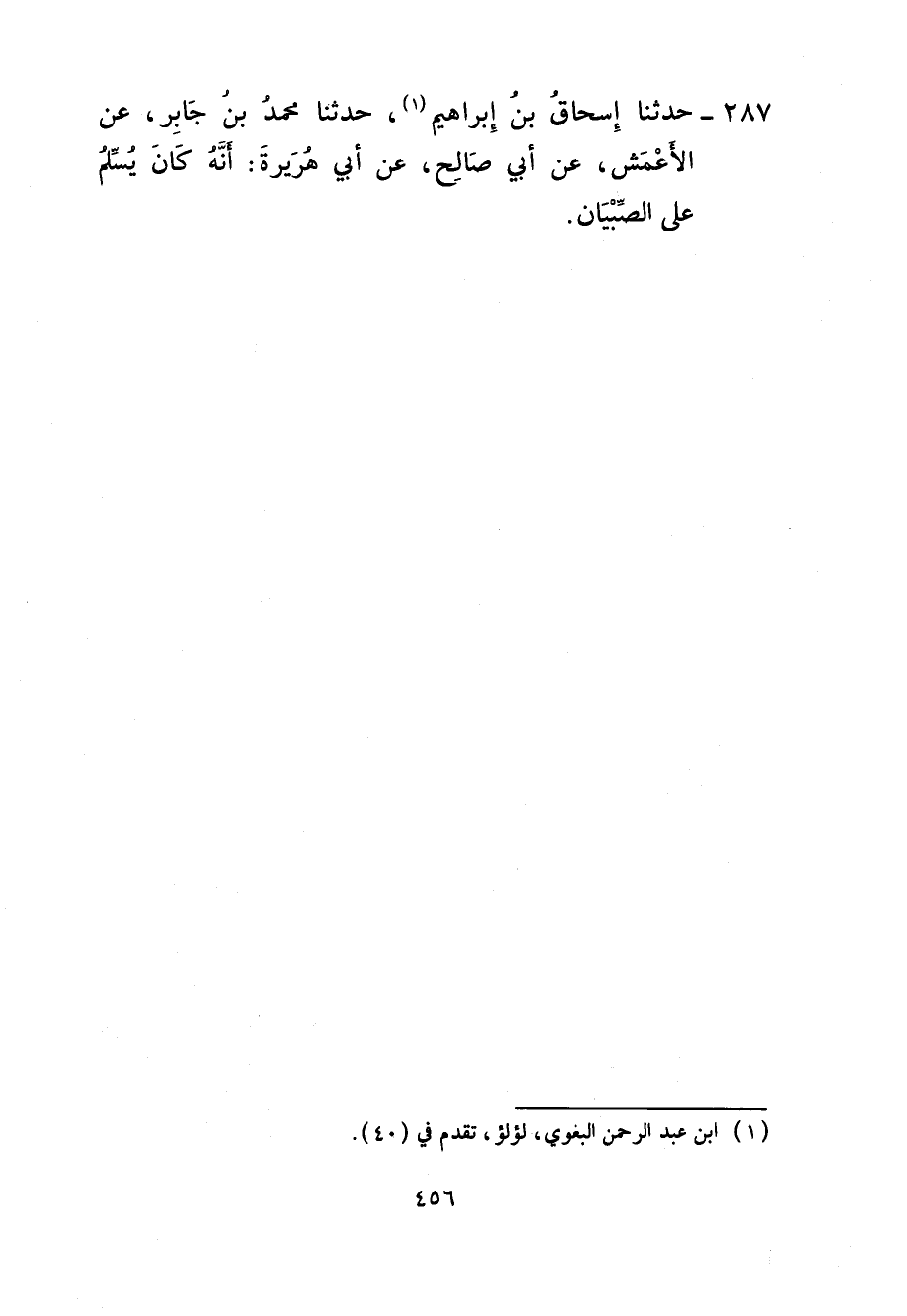 287 - حَدَّثَنَا إِسْحَاقُ بْنُ إِبْرَاهِيمَ، حَدَّثَنَا مُحَمَّدُ بْنُ جَابِرٍ، عَنِ الْأَعْمَشِ، عَنْ أَبِي صَالِحٍ، عَنْ أَبِي هُرَيْرَةَ، أَنَّهُ كَانَ §يُسَلِّمُ عَلَى الصِّبْيَانِ