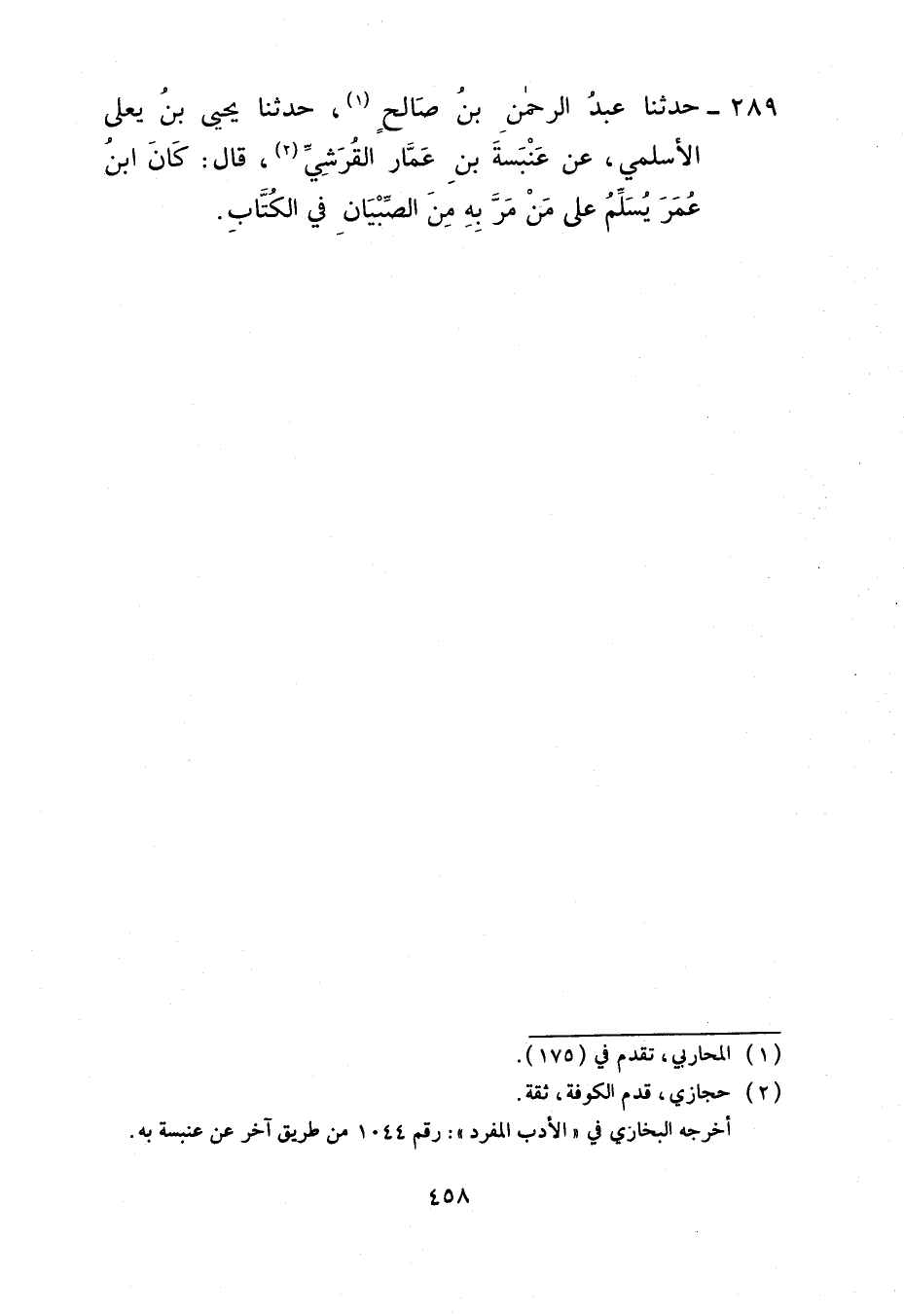289 - حَدَّثَنَا عَبْدُ الرَّحْمَنِ بْنُ صَالِحٍ، حَدَّثَنَا يَحْيَى بْنُ يَعْلَى الْأَسْلَمِيُّ، عَنْ عَنْبَسَةَ بْنِ عَمَّارٍ الْقُرَشِيِّ، قَالَ: كَانَ ابْنُ عُمَرَ §يُسَلِّمُ عَلَى مَنْ مَرَّ بِهِ مِنَ الصِّبْيَانِ فِي الْكُتَّابِ