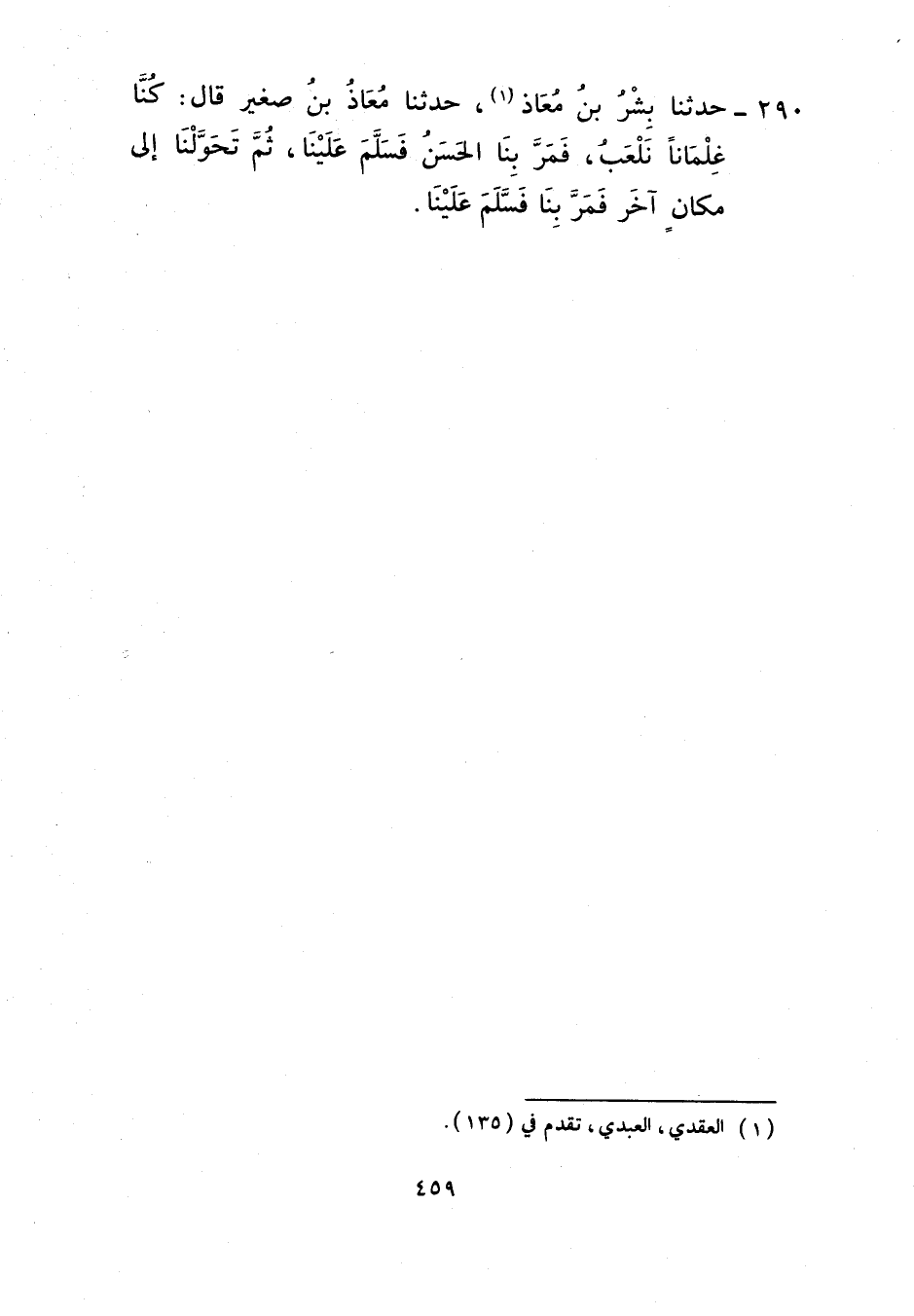 290 - حَدَّثَنَا بِشْرُ بْنُ مُعَاذٍ، حَدَّثَنَا مُعَاذُ بْنُ صَغِيرٍ، قَالَ: كُنَّا غِلْمَانًا نَلْعَبُ §فَمَرَّ بِنَا الْحَسَنُ فَسَلَّمَ عَلَيْنَا ثُمَّ تَحَوَّلْنَا إِلَى مَكَانٍ آخَرَ فَمَرَّ بِنَا فَسَلَّمَ عَلَيْنَا