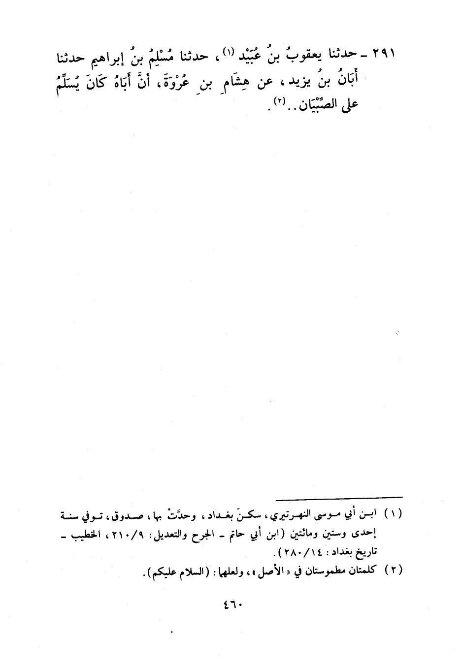 291 - حَدَّثَنَا يَعْقُوبُ بْنُ عُبَيْدٍ، حَدَّثَنَا مُسْلِمُ بْنُ إِبْرَاهِيمَ، حَدَّثَنَا أَبَانُ بْنُ يَزِيدَ، عَنْ هِشَامِ بْنِ عُرْوَةَ، أَنَّ أَبَاهُ «كَانَ §يُسَلِّمُ عَلَى الصِّبْيَانِ»