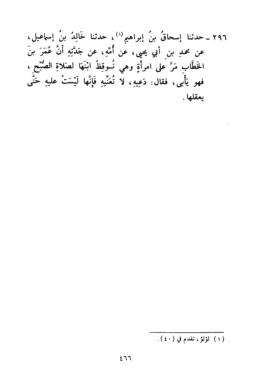 296 - حَدَّثَنَا إِسْحَاقُ بْنُ إِبْرَاهِيمَ، حَدَّثَنَا خَالِدُ بْنُ إِسْمَاعِيلَ، عَنْ مُحَمَّدِ بْنِ أَبِي يَحْيَى، عَنْ أُمِّهِ، عَنْ جَدَّتِهِ، أَنَّ عُمَرَ بْنَ الْخَطَّابِ، مَرَّ عَلَى امْرَأَةٍ وَهِيَ تُوقِظُ ابْنَهَا لِصَلَاةِ الصُّبْحِ فَهُوَ يَأْبَى فَقَالَ: دَعِيهِ لَا تُعَنِّيهِ فَإِنَّهَا §لَيْسَتْ عَلَيْهِ حَتَّى يَعْقِلَهَا