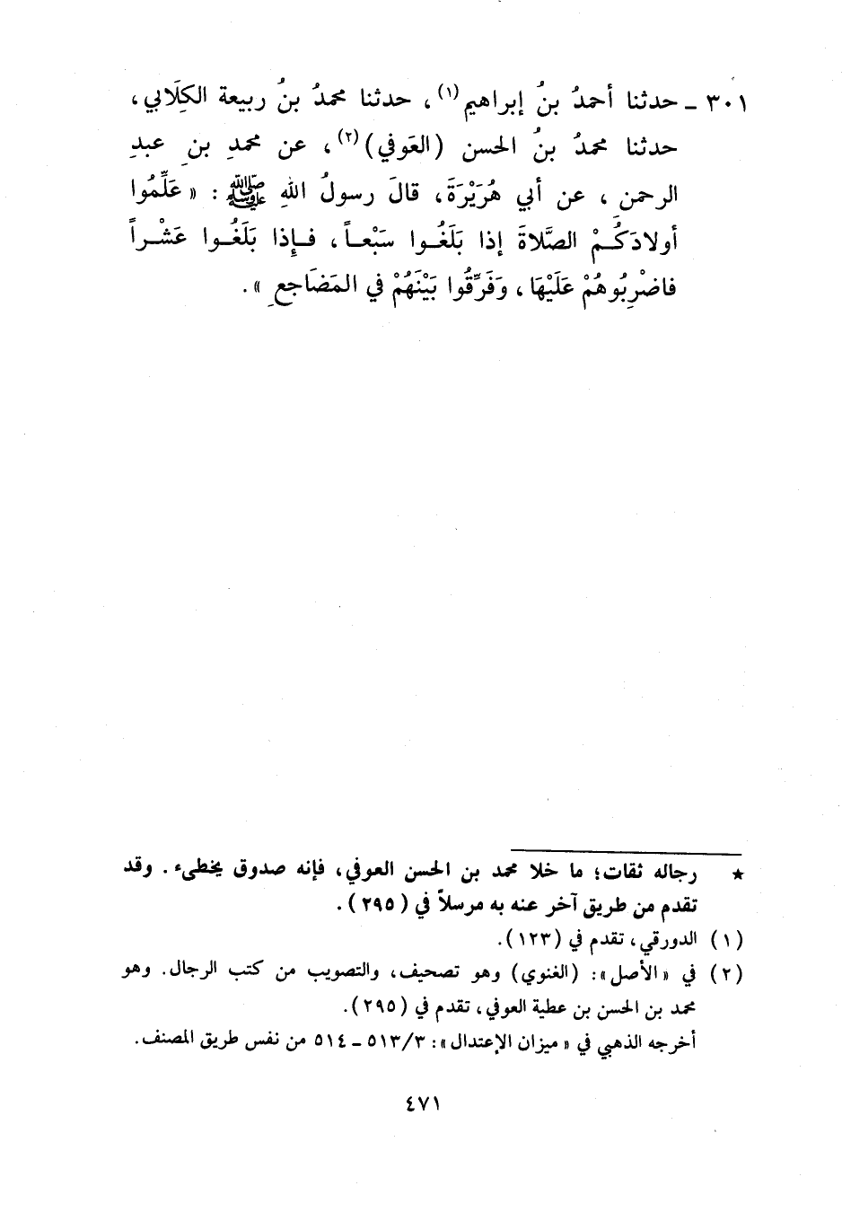 301 - حَدَّثَنَا أَحْمَدُ بْنُ إِبْرَاهِيمَ، حَدَّثَنَا مُحَمَّدُ بْنُ رَبِيعَةَ الْكِلَابِيُّ، حَدَّثَنَا مُحَمَّدُ بْنُ الْحَسَنِ الْعَوْفِيُّ، عَنْ مُحَمَّدِ بْنِ عَبْدِ الرَّحْمَنِ، عَنْ أَبِي هُرَيْرَةَ، قَالَ رَسُولُ اللَّهِ صَلَّى اللهُ عَلَيْهِ وَسَلَّمَ: «§عَلِّمُوا أَوْلَادَكُمُ الصَّلَاةَ إِذَا بَلَغُوا سَبْعًا فَإِذَا بَلَغُوا عَشْرًا فَاضْرِبُوهُمْ عَلَيْهَا وَفَرِّقُوا بَيْنَهُمْ فِي الْمَضَاجِعِ»