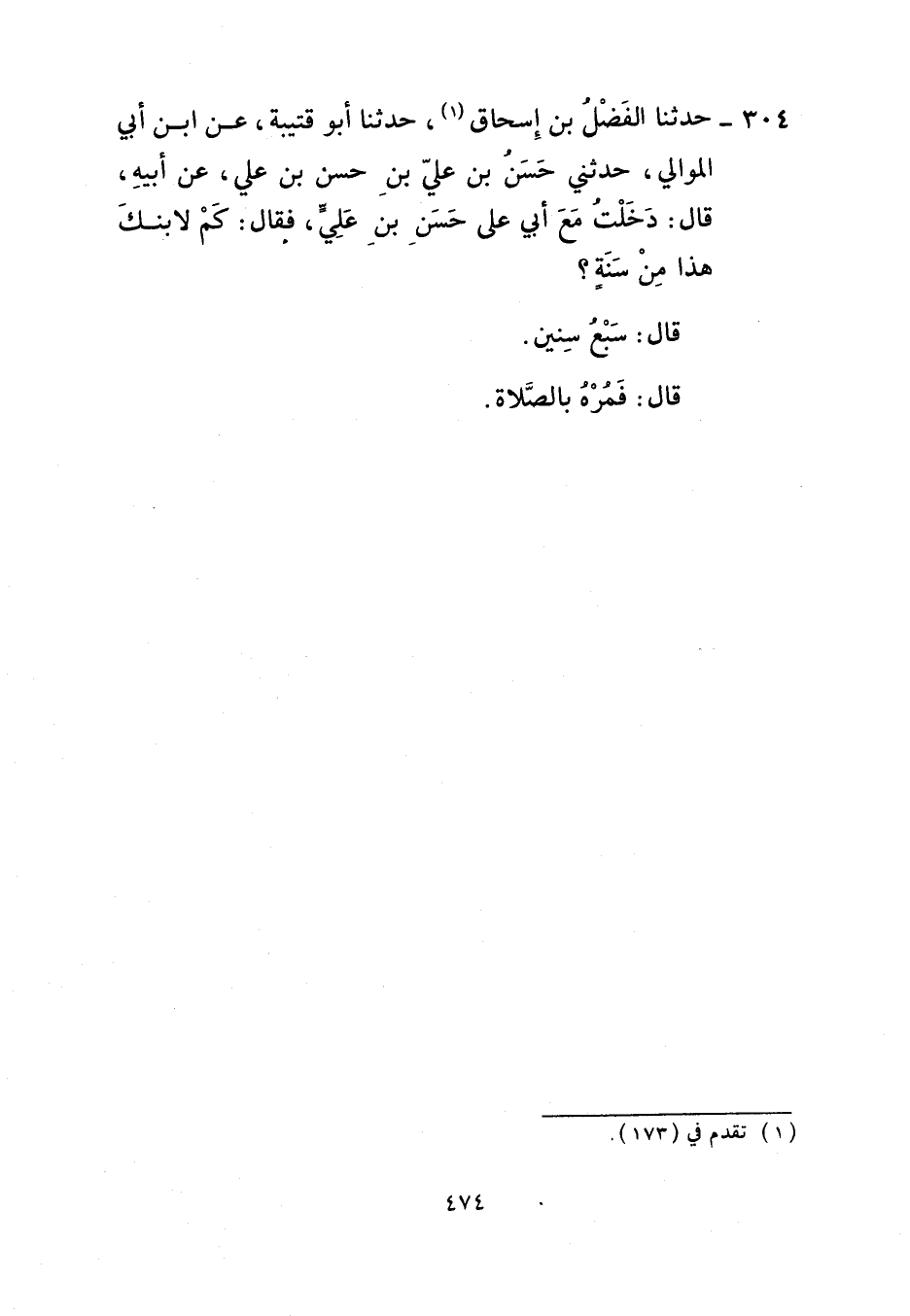 304 - حَدَّثَنَا الْفَضْلُ بْنُ إِسْحَاقَ، حَدَّثَنَا أَبُو قُتَيْبَةَ، عَنِ ابْنِ أَبِي الْمَوَالِي، حَدَّثَنِي حَسَنُ بْنُ عَلِيِّ بْنِ حَسَنِ بْنِ عَلِيٍّ، عَنْ أَبِيهِ، قَالَ: دَخَلْتُ مَعَ أَبِي عَلَى حَسَنِ بْنِ عَلِيٍّ فَقَالَ: كَمْ لِابْنِكَ هَذَا مِنْ سَنَةٍ؟ قَالَ: سَبْعُ سِنِينَ قَالَ: §فَمُرْهُ بِالصَّلَاةِ