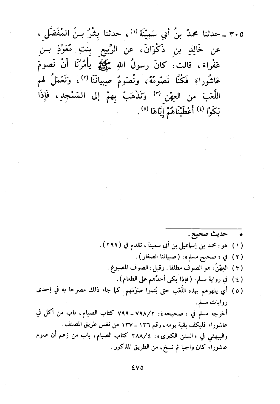 305 - حَدَّثَنَا مُحَمَّدُ بْنُ أَبِي سَمِينَةَ، حَدَّثَنَا بِشْرُ بْنُ الْمُفَضَّلِ، عَنْ خَالِدِ بْنِ ذَكْوَانَ، عَنِ الرُّبَيِّعِ بِنْتِ مُعَوِّذِ بْنِ عَفْرَاءَ، قَالَتْ: كَانَ رَسُولُ اللَّهِ صَلَّى اللهُ عَلَيْهِ وَسَلَّمَ §يَأْمُرُنَا أَنْ نَصُومَ عَاشُورَاءَ فَكُنَّا نَصُومُهُ وَنُصَوِّمُ صِبْيَانَنَا وَنَعْمَلُ لَهُمُ اللَّعِبَ مِنَ الْعِهْنِ وَنَذْهَبُ بِهِمْ إِلَى الْمَسْجِدِ فَإِذَا بَكَوْا أَعْطَيْنَاهُمْ إِيَّاهَا