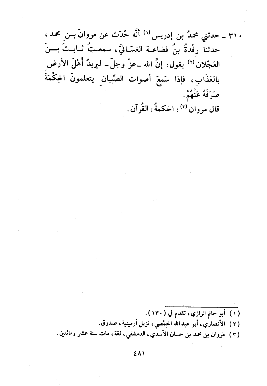 310 - حَدَّثَنِي مُحَمَّدُ بْنُ إِدْرِيسَ، أَنَّهُ حُدِّثَ عَنْ مَرْوَانَ بْنِ مُحَمَّدٍ، حَدَّثَنَا رِفْدَةُ بْنُ قُضَاعَةَ الْغَسَّانِيُّ، سَمِعْتُ ثَابِتَ بْنَ الْعَجْلَانِ، يَقُولُ: إِنَّ اللَّهَ عَزَّ وَجَلَّ §لَيُرِيدُ أَهْلَ الْأَرْضِ بِالْعَذَابِ فَإِذَا سَمِعَ أَصْوَاتَ الصِّبْيَانِ يَتَعَلَّمُونَ الْحِكْمَةَ صَرَفَهُ عَنْهُمْ قَالَ مَرْوَانُ: الْحِكْمَةُ الْقُرْآنُ