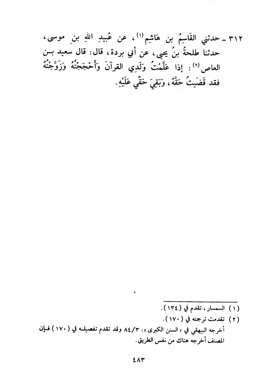 312 - حَدَّثَنِي الْقَاسِمُ بْنُ هَاشِمٍ، عَنْ عُبَيْدِ اللَّهِ بْنِ مُوسَى، حَدَّثَنَا طَلْحَةُ بْنُ يَحْيَى، عَنْ أَبِي بُرْدَةَ، قَالَ: قَالَ سَعِيدُ بْنُ الْعَاصِ: «§إِذَا عَلَّمْتُ وَلَدِي الْقُرْآنَ وَأَحْجَجْتُهُ وَزَوَّجْتُهُ فَقَدْ قَضَيْتُ حَقَّهُ وَبَقِيَ حَقِّي عَلَيْهِ»