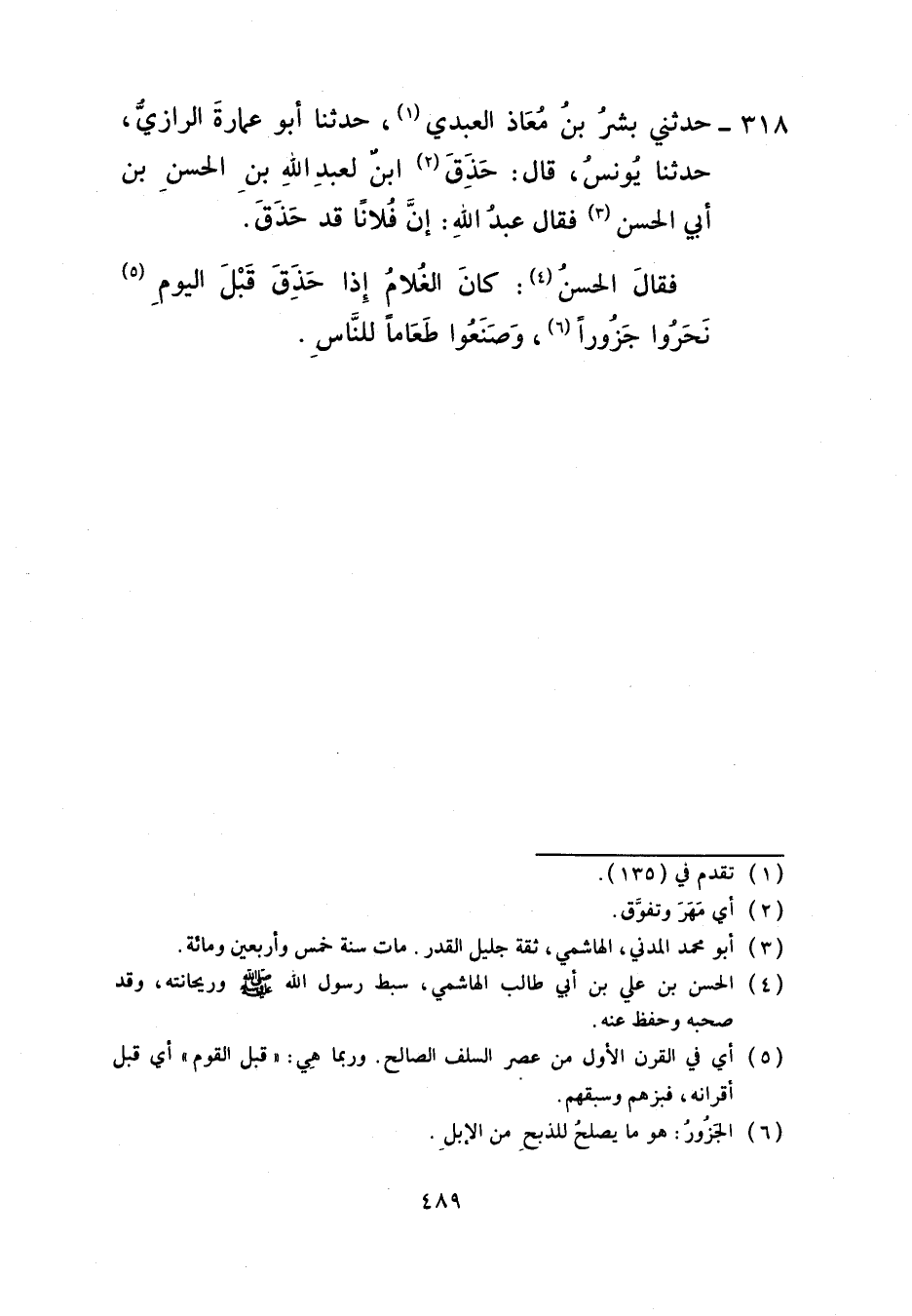318 - حَدَّثَنِي بِشْرُ بْنُ مُعَاذٍ الْعَقَدِيُّ، حَدَّثَنَا أَبُو عُمَارَةَ الرَّازِيُّ، حَدَّثَنَا يُونُسُ، قَالَ: حَذَقَ ابْنٌ لِعَبْدِ اللَّهِ بْنِ الْحَسَنِ بْنِ أَبِي الْحَسَنِ فَقَالَ عَبْدُ اللَّهِ: إِنَّ فُلَانًا قَدْ حَذَقَ فَقَالَ الْحَسَنُ: «كَانَ الْغُلَامُ §إِذَا حَذَقَ قَبْلَ الْيَوْمِ نَحَرُوا جَزُورًا وَصَنَعُوا طَعَامًا لِلنَّاسِ»
