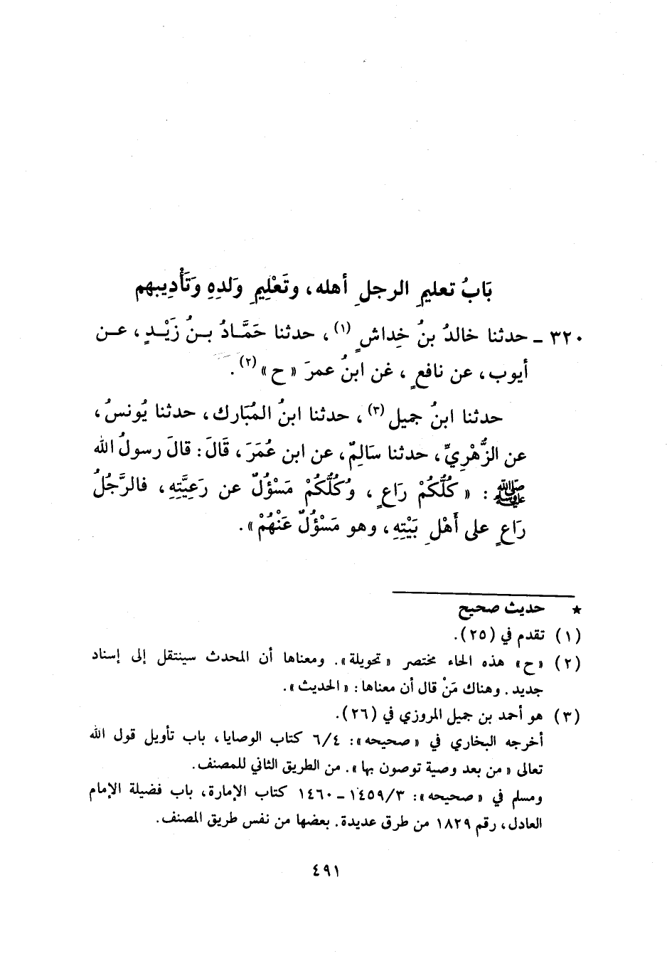 320 - حَدَّثَنَا خَالِدُ بْنُ خِدَاشٍ، حَدَّثَنَا حَمَّادُ بْنُ زَيْدٍ، عَنْ أَيُّوبَ، عَنْ نَافِعٍ، عَنِ ابْنِ عُمَرَ (ح) حَدَّثَنَا ابْنُ جَمِيلٍ، حَدَّثَنَا ابْنُ الْمُبَارَكِ، حَدَّثَنَا يُونُسُ، عَنِ الزُّهْرِيِّ، حَدَّثَنَا سَالِمٌ، عَنِ ابْنِ عُمَرَ، قَالَ: قَالَ رَسُولُ اللَّهِ صَلَّى اللهُ عَلَيْهِ وَسَلَّمَ: «§كُلُّكُمْ رَاعٍ وَكُلُّكُمْ مَسْئُولٌ عَنْ رَعِيَّتِهِ فَالرَّجُلُ رَاعٍ عَلَى أَهْلِ بَيْتِهِ وَهُوَ مَسْئُولٌ عَنْهُمْ»