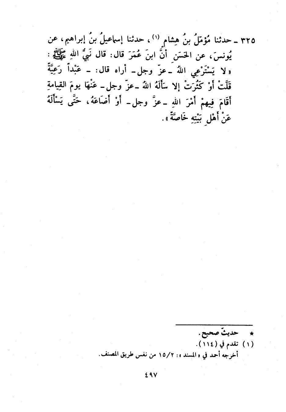 325 - حَدَّثَنَا مُؤَمَّلُ بْنُ هِشَامٍ، حَدَّثَنَا إِسْمَاعِيلُ بْنُ إِبْرَاهِيمَ، عَنْ يُونُسَ، عَنِ الْحَسَنِ، أَنَّ ابْنَ عُمَرَ، قَالَ: قَالَ نَبِيُّ اللَّهِ صَلَّى اللهُ عَلَيْهِ وَسَلَّمَ: «§لَا يَسْتَرْعِي اللَّهُ عَزَّ وَجَلَّ» أُرَاهُ قَالَ: «عَبْدًا رَعِيَّةً» قُلْتُ: أَوْ كَثُرَتْ إِلَّا سَأَلَهُ اللَّهُ عَزَّ وَجَلَّ عَنْهَا يَوْمَ الْقِيَامَةِ أَقَامَ فِيهِمْ أَمْرَ اللَّهِ عَزَّ وَجَلَّ أَوْ أَضَاعَهُ حَتَّى يَسْأَلَهُ عَنْ أَهْلِ بَيْتِهِ خَاصَّةً