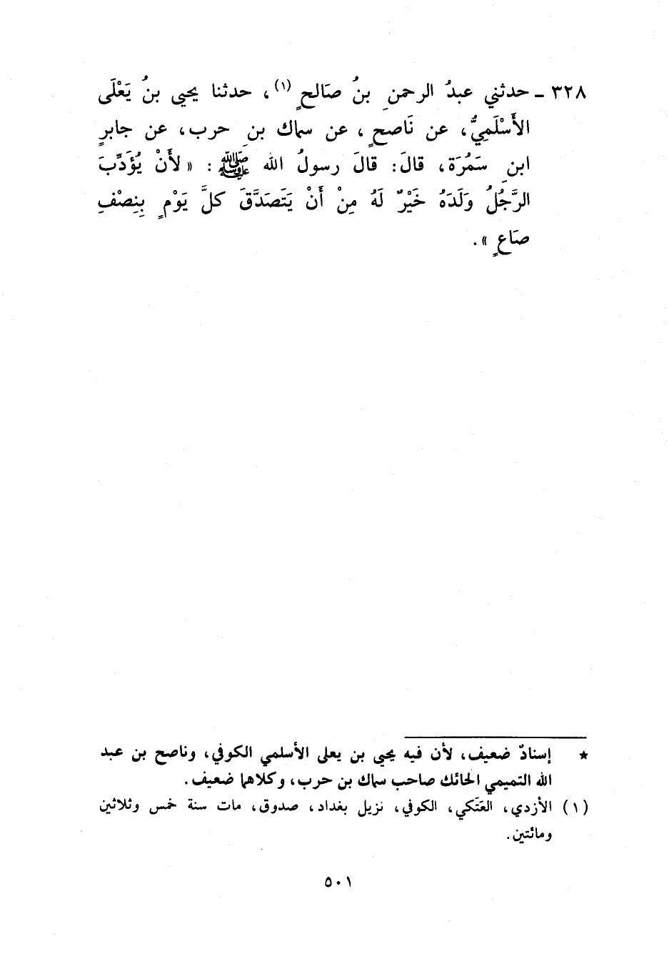 328 - حَدَّثَنِي عَبْدُ الرَّحْمَنِ بْنُ صَالِحٍ، حَدَّثَنَا يَحْيَى بْنُ يَعْلَى الْأَسْلَمِيُّ، عَنْ نَاصِحٍ، عَنْ سِمَاكِ بْنِ حَرْبٍ، عَنْ جَابِرِ بْنِ سَمُرَةَ، قَالَ: قَالَ رَسُولُ اللَّهِ صَلَّى اللهُ عَلَيْهِ وَسَلَّمَ: «§لِأَنْ يُؤَدِّبَ الرَّجُلُ وَلَدَهُ خَيْرٌ لَهُ مِنْ أَنْ يَتَصَدَّقَ كُلَّ يَوْمٍ بِنِصْفِ صَاعٍ»