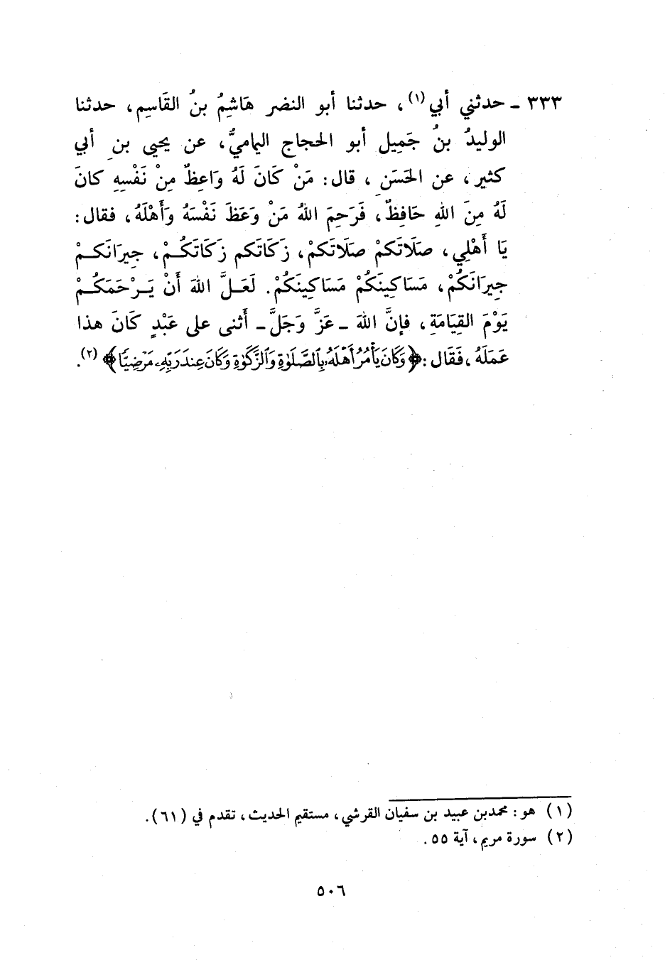 333 - حَدَّثَنِي أَبِي، حَدَّثَنَا أَبُو النَّضْرِ هَاشِمُ بْنُ الْقَاسِمِ، حَدَّثَنَا الْوَلِيدُ بْنُ جَمِيلٍ أَبُو الْحَجَّاجِ الْيَمَامِيُّ، عَنْ يَحْيَى بْنِ أَبِي كَثِيرٍ، عَنِ الْحَسَنِ، قَالَ: §مَنْ كَانَ لَهُ وَاعِظٌ مِنْ نَفْسِهِ كَانَ لَهُ مِنَ اللَّهِ حَافِظٌ فَرَحِمَ اللَّهُ مَنْ وَعَظَ نَفْسَهُ وَأَهْلَهُ فَقَالَ: يَا أَهْلِي صَلَاتَكُمْ صَلَاتَكُمْ زَكَاتَكُمْ زَكَاتَكُمْ جِيرَانَكُمْ جِيرَانَكُمْ مَسَاكِينَكُمْ مَسَاكِينَكُمْ لَعَلَّ اللَّهَ أَنْ يَرْحَمَكُمْ يَوْمَ الْقِيَامَةِ فَإِنَّ اللَّهَ عَزَّ وَجَلَّ أَثْنَى عَلَى عَبْدٍ كَانَ هَذَا عَمَلَهُ فَقَالَ: {وَكَانَ يَأْمُرُ أَهْلَهُ بِالصَّلَاةِ وَالزَّكَاةِ وَكَانَ عِنْدَ رَبِّهِ مَرْضِيًّا} [مريم: 55]