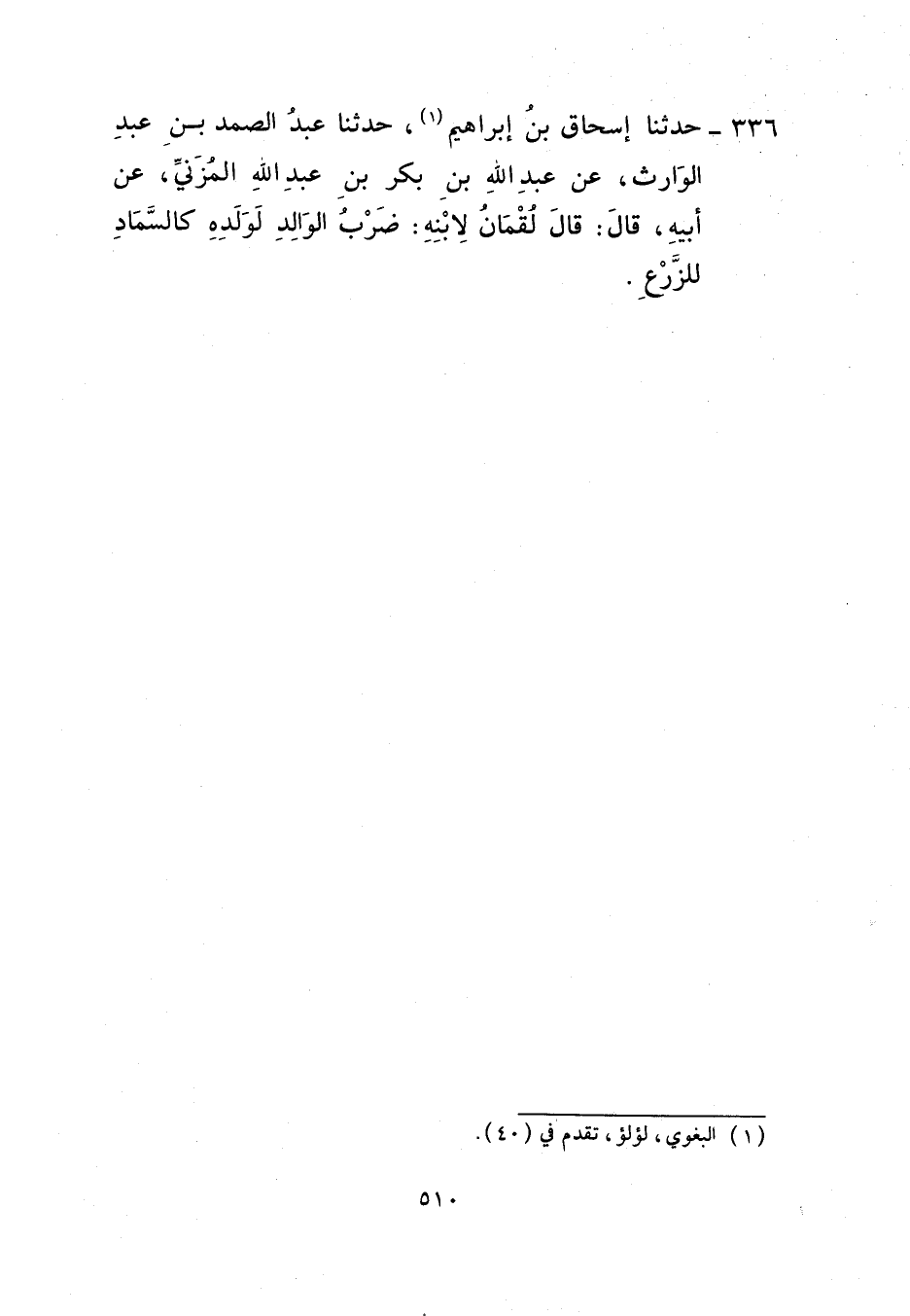 336 - حَدَّثَنَا إِسْحَاقُ بْنُ إِبْرَاهِيمَ، حَدَّثَنَا عَبْدُ الصَّمَدِ بْنُ عَبْدِ الْوَارِثِ، عَنْ عَبْدِ اللَّهِ بْنِ بَكْرِ بْنِ عَبْدِ اللَّهِ الْمُزَنِيِّ، عَنْ أَبِيهِ، قَالَ: قَالَ لُقْمَانُ لِابْنِهِ: §ضَرْبُ الْوَالِدِ لِوَلَدِهِ كَالسِّمَادِ لِلزَّرْعِ