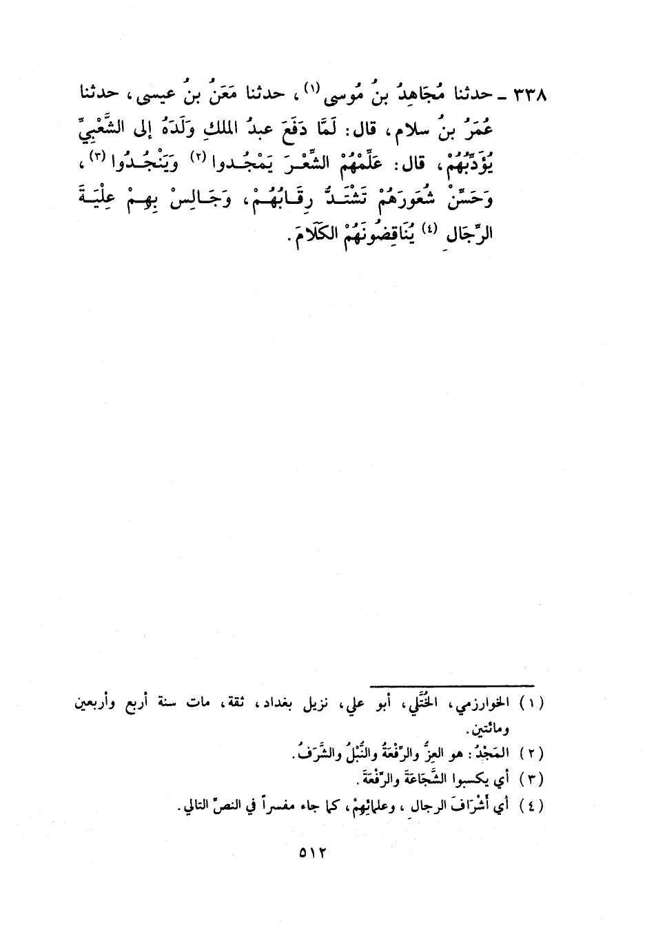 338 - حَدَّثَنَا مُجَاهِدُ بْنُ مُوسَى، حَدَّثَنَا مَعْنُ بْنُ عِيسَى، حَدَّثَنَا عُمَرُ بْنُ سَلَامٍ، قَالَ: لَمَّا دَفَعَ عَبْدُ الْمَلِكِ وَلَدَهُ إِلَى الشَّعْبِيِّ يُؤَدِّبُهُمْ قَالَ: «§عَلِّمْهُمُ الشِّعْرَ يَمْجُدُوا وَيَنْجُدُوا وَحَسِّنْ شُعُورَهُمْ تَشْتَدَّ رِقَابُهُمْ وَجَالِسْ بِهِمْ عِلْيَةَ الرِّجَالِ يُنَاقِضُونَهُمُ الْكَلَامَ»