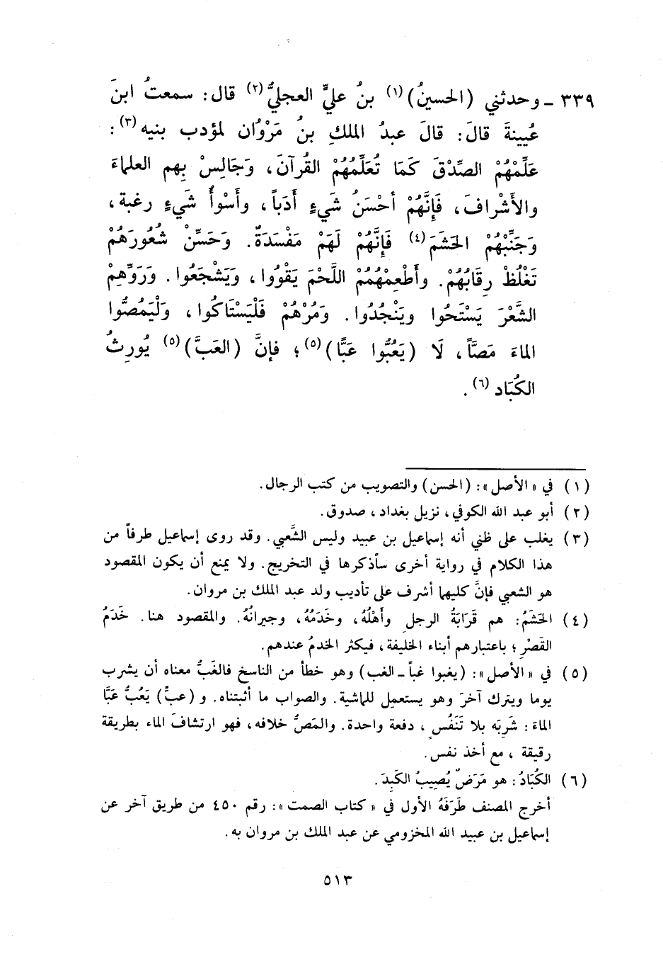 339 - وَحَدَّثَنِي الْحُسَيْنُ بْنُ عَلِيٍّ الْعِجْلِيُّ، قَالَ: سَمِعْتُ ابْنَ عُيَيْنَةَ، قَالَ: قَالَ عَبْدُ الْمَلِكِ بْنُ مَرْوَانَ لِمُؤَدِّبِ بَنِيهِ: §عَلِّمْهُمُ الصِّدْقَ كَمَا تُعَلِّمُهُمُ الْقُرْآنَ وَجَالِسْ بِهِمُ الْعُلَمَاءَ وَالْأَشْرَافَ فَإِنَّهُمْ أَحْسَنُ شَيْءٍ أَدَبًا وَأَسْوَأُ شَيْءٍ رَغْبَةً وَجَنِّبْهُمُ الْحَشَمَ فَإِنَّهُمْ لَهُمْ مَفْسَدَةٌ وَحَسِّنْ شُعُورَهُمْ تَغْلُظْ رِقَابُهُمْ وَأَطْعِمْهُمُ اللَّحْمَ يَقْوَوْا وَيَشْجُعُوا وَرَوِّهِمُ الشِّعْرَ يَسْتَحُوا وَيَنْجُدُوا وَمُرْهُمْ فَلْيَسْتَاكُوا وَلْيَمُصُّوا الْمَاءَ مَصًّا لَا يَعُبُّوا عَبًّا فَإِنَّ الْعَبَّ يُوَرِّثُ الْكِبَادَ