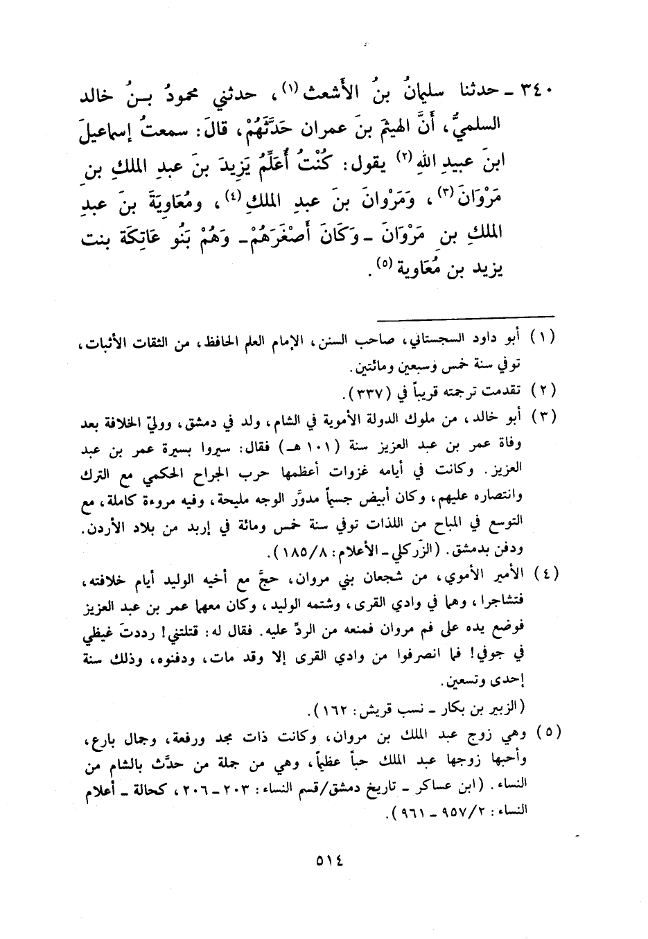 340 - حَدَّثَنَا سُلَيْمَانُ بْنُ الْأَشْعَثِ، حَدَّثَنِي مَحْمُودُ بْنُ خَالِدٍ السُّلَمِيُّ، أَنَّ الْهَيْثَمَ بْنَ عِمْرَانَ حَدَّثَهُمْ , قَالَ: سَمِعْتُ إِسْمَاعِيلَ بْنَ عُبَيْدِ اللَّهِ، يَقُولُ: كُنْتُ أُعَلِّمُ يَزِيدَ بْنَ عَبْدِ الْمَلِكِ بْنِ مَرْوَانَ، وَمَرْوَانَ بْنَ عَبْدِ الْمَلِكِ، وَمُعَاوِيَةَ بْنَ عَبْدِ الْمَلِكِ بْنِ مَرْوَانَ وَكَانَ أَصْغَرَهُمْ، وَهُمْ بَنُو عَاتِكَةَ بِنْتِ يَزِيدَ بْنِ مُعَاوِيَةَ -[515]-، قَالَ: فَكُنْتُ عَلَى فِرَاشٍ وَهُمْ بَيْنَ يَدَيَّ يَتَعَلَّمُونَ، فَأَقْبَلَ عَبْدُ الْمَلِكِ يَمْشِي بِغَيْرِ رِدَاءٍ فَلَمَّا نَظَرْتُ إِلَيْهِ يَؤُمُّنِي يُرِيدُ أَنْ يَجْلِسَ عِنْدِي فَقُمْتُ عَنِ الْفِرَاشِ فَقَالَ عَبْدُ الْمَلِكِ: اجْلِسْ يَا إِسْمَاعِيلُ مَكَانَكَ فَجَلَسْتُ وَقَامَ قَائِمًا فَقَالَ يَا غُلَامُ: ائْتِنِي بِوِسَادَةٍ فَأُوتِيَتْ لَهُ وِسَادَةٌ فَجَلَسَ مَعَهُ بَنُوهُ بَيْنَ يَدَيَّ أَوْ إِلَى جَانِبِي فَقَالُوا: يَا أَمِيرَ الْمُؤْمِنِينَ إِنَّ إِسْمَاعِيلَ قَدْ عَمَّنَا بِالتَّعْلِيمِ فَإِنْ رَأَيْتَ أَنْ تَدَعَنَا نَلْعَبُ قَالَ: بِأَيِّ شَيْءٍ تُرِيدُونَ أَنْ تَلْعَبُوا؟ قَالُوا: بِالْجَوْزِ فَقَالَ: يَا غُلَامُ، ائْتِنَا بِقُفَّةٍ مِنْ جَوْزٍ وَأَخَذُوا يَلْعَبُونَ وَأَخَذَ عَبْدُ الْمَلِكِ يُعِينُ ابْنَهُ الْأَوْسَطَ مَرْوَانَ عَلَى مُعَاوِيَةَ الْأَصْغَرِ إِذْ فَرَّ الْأَصْغَرُ فَبَكَى قَالَ: يَقُولُ لَهُ عَبْدُ الْمَلِكِ: فِي شَأْنِ عَشْرِ جَوْزَاتٍ قَمَرَكَ تَبْكِي نَحْنُ نَهَبُ لَكَ غِرَارَةً مَلْأَى، قَالَ الْغُلَامُ: وَاللَّهِ مَا أَبْكِي أَنْ قَمَرَنِي وَلَكِنْ §أَبْكِي عَلَى تَعْلِيمِكَ إِيَّاهُ عَلَيَّ مُنْذُ الْيَوْمِ -[516]-، قَالَ إِسْمَاعِيلُ: فَقُلْتُ لِيَزِيدَ: أَلَا تَرَى إِلَى أَخِيكَ بَكَى مِنْ عَشْرِ جَوْزَاتٍ؟ فَنَكَّسَ الْغُلَامُ حَيَاءً وَلَمْ يُجِبْنِي - يَعْنِي يَزِيدَ - فَقَالَ عَبْدُ الْمَلِكِ حِينَ رَآهُ لَا يَتَكَلَّمُ: قَدِ اسْتَحْيَى لَنَجِدَنَّ أَبَا خَالِدٍ حَلِيمًا سَكُوتًا - يَعْنِي يَزِيدَ - إِذْ لَعِبُوا وَضَحِكُوا فَقَالَ: يَا بَنِيَّ تَضْحَكُونَ وَتَلْعَبُونَ وَقَدْ مَرَّ عَلَى رَأْسِ أَبِيكُمْ مَا قَدْ مَرَّ، قَالُوا: وَأَنْتَ يَا أَمِيرَ الْمُؤْمِنِينَ وَالنَّاسُ تَحْتَكَ فَبِأَيِّ شَيْءٍ؟ قَالَ: يَا بَنِيَّ قَدْ كُنْتُ أَرَى وَأَنَا أَغْزُو إِلَى أَهْلِ الْعِرَاقِ بِأَهْلِ الشَّامِ فَإِذَا أَهْلُ الْعِرَاقِ كَأَمْثَالِ الْجِبَالِ كَثْرَةً وَإِذَا أَنْصَارِي مِنْ أَهْلِ الشَّامِ تُحَامِيهِمْ أَعْدَاءٌ فَيَذْهَبُ عَقْلِي طَوِيلًا، ثُمَّ رَدَّهُ اللَّهُ إِلَيَّ بَعْدُ