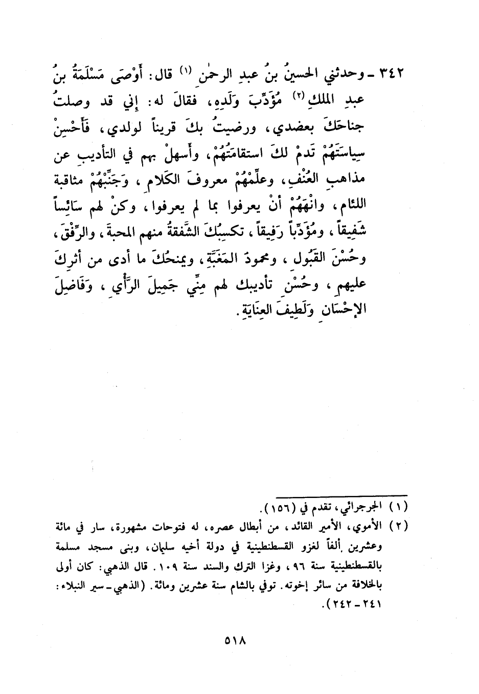 342 - وَحَدَّثَنِي الْحُسَيْنُ بْنُ عَبْدِ الرَّحْمَنِ، قَالَ: أَوْصَى مَسْلَمَةُ بْنُ عَبْدِ الْمَلِكِ مُؤَدِّبَ وَلَدِهِ فَقَالَ لَهُ: إِنِّي قَدْ وَصَلْتُ جَنَاحَكَ بِعَضُدِي وَرَضِيتُ بِكَ قَرِينًا لِوَلَدِي §فَأَحْسِنْ سِيَاسَتَهُمْ تَدُمْ لَكَ اسْتِقَامَتُهُمْ وَأَسْهِلْ بِهِمْ فِي التَّأْدِيبِ عَنْ مَذَاهِبِ الْعُنْفِ وَعَلِّمْهُمْ مَعْرُوفَ الْكَلَامِ وَجَنِّبْهُمُ مُثَاقَبَةَ اللِّئَامِ وَانْهَهُمْ أَنْ يُعْرَفُوا بِمَا لَمْ يُعْرَفُوا وَكُنْ لَهُمْ سَائِسًا شَفِيقًا وَمُؤَدِّبًا رَفِيقًا تُكْسِبْكَ الشَّفَقَةُ مِنْهُمُ الْمَحَبَّةَ وَالرِّفْقَ وَحُسْنَ الْقَبُولِ وَمَحْمُودَ الْمَغَبَّةِ وَيَمْنَحْكَ مَا أَدَّى مِنْ أَثَرِكَ عَلَيْهِمْ وَحُسْنُ تَأْدِيبِكَ لَهُمْ مِنِّي جَمِيلُ الرَّأْيِ وَفَاضِلُ الْإِحْسَانِ وَلَطِيفُ الْعِنَايَةِ