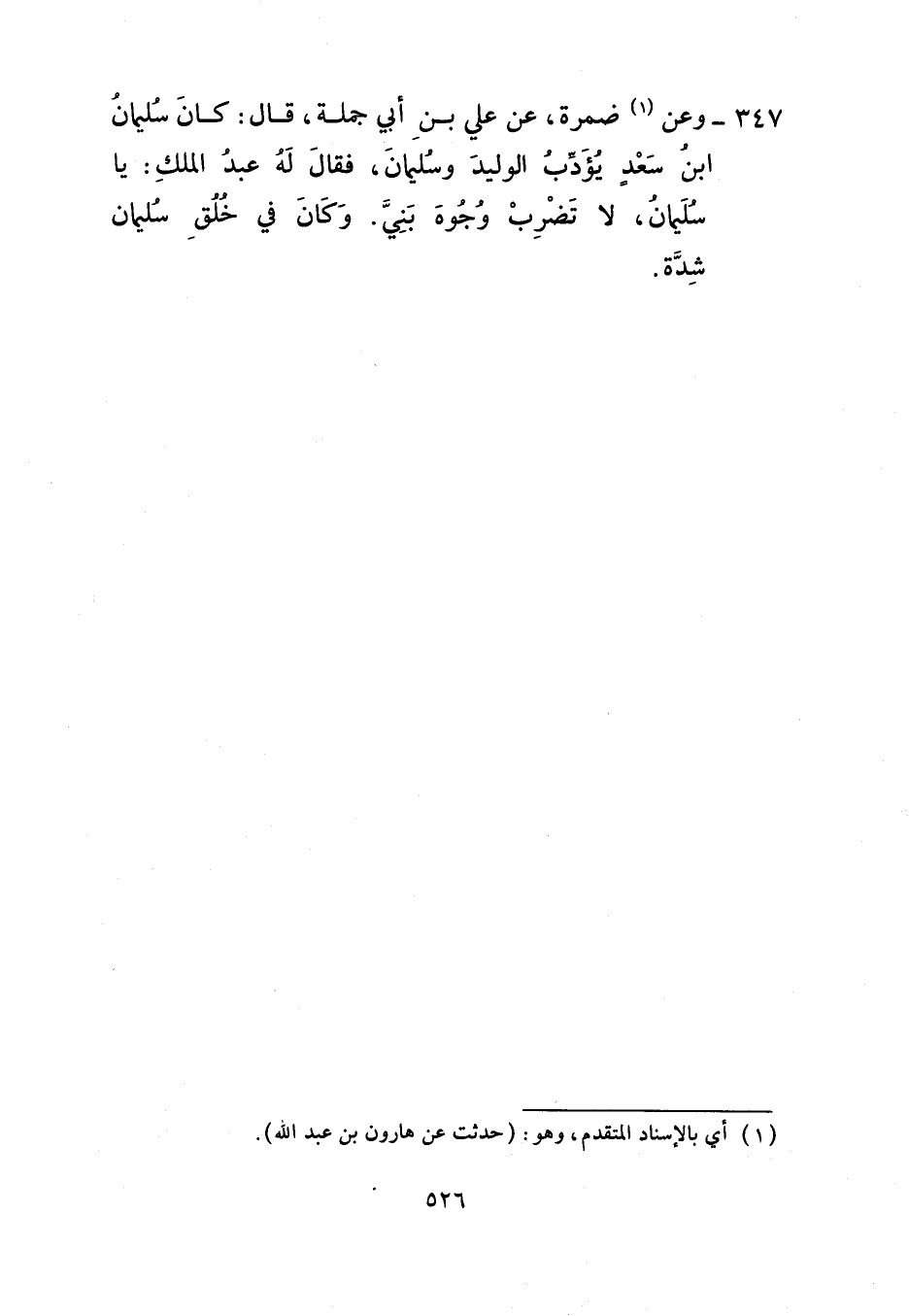 347 - وَعَنْ ضَمْرَةَ، عَنْ عَلِيِّ بْنِ أَبِي حَمْلَةَ، قَالَ: كَانَ سُلَيْمَانُ بْنُ سَعْدٍ يُؤَدِّبُ الْوَلِيدَ وَسُلَيْمَانَ فَقَالَ لَهُ عَبْدُ الْمَلِكِ: «يَا سُلَيْمَانُ §لَا تَضْرِبْ وُجُوهَ بَنِيَّ» وَكَانَ فِي خُلُقِ سُلَيْمَانَ شِدَّةٌ