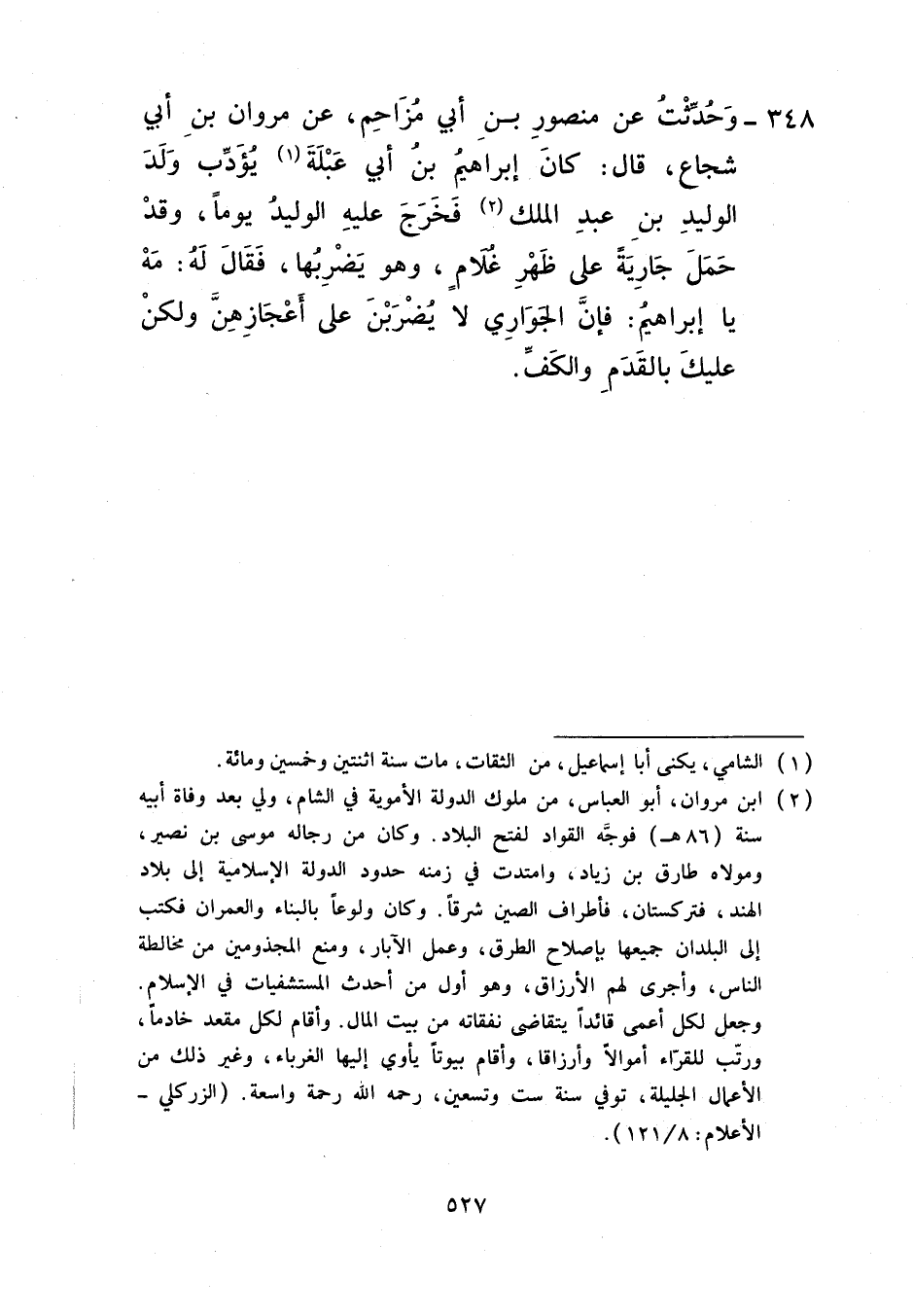 348 - وَحُدِّثْتُ عَنْ مَنْصُورِ بْنِ أَبِي مُزَاحِمٍ، عَنْ مَرْوَانَ بْنِ أَبِي شُجَاعٍ، قَالَ: كَانَ إِبْرَاهِيمُ بْنُ أَبِي عَبْلَةَ يُؤَدِّبُ وَلَدَ الْوَلِيدِ بْنِ عَبْدِ الْمَلِكِ فَخَرَجَ عَلَيْهِ الْوَلِيدُ يَوْمًا وَقَدْ حَمَلَ جَارِيَةً عَلَى ظَهْرِ غُلَامٍ وَهُوَ يَضْرِبُهَا فَقَالَ لَهُ: مَهْ يَا إِبْرَاهِيمُ فَإِنَّ §الْجَوَارِيَ لَا يُضْرَبْنَ عَلَى أَعْجَازِهِنَّ وَلَكِنْ عَلَيْكَ بِالْقَدَمِ وَالْكَفِّ
