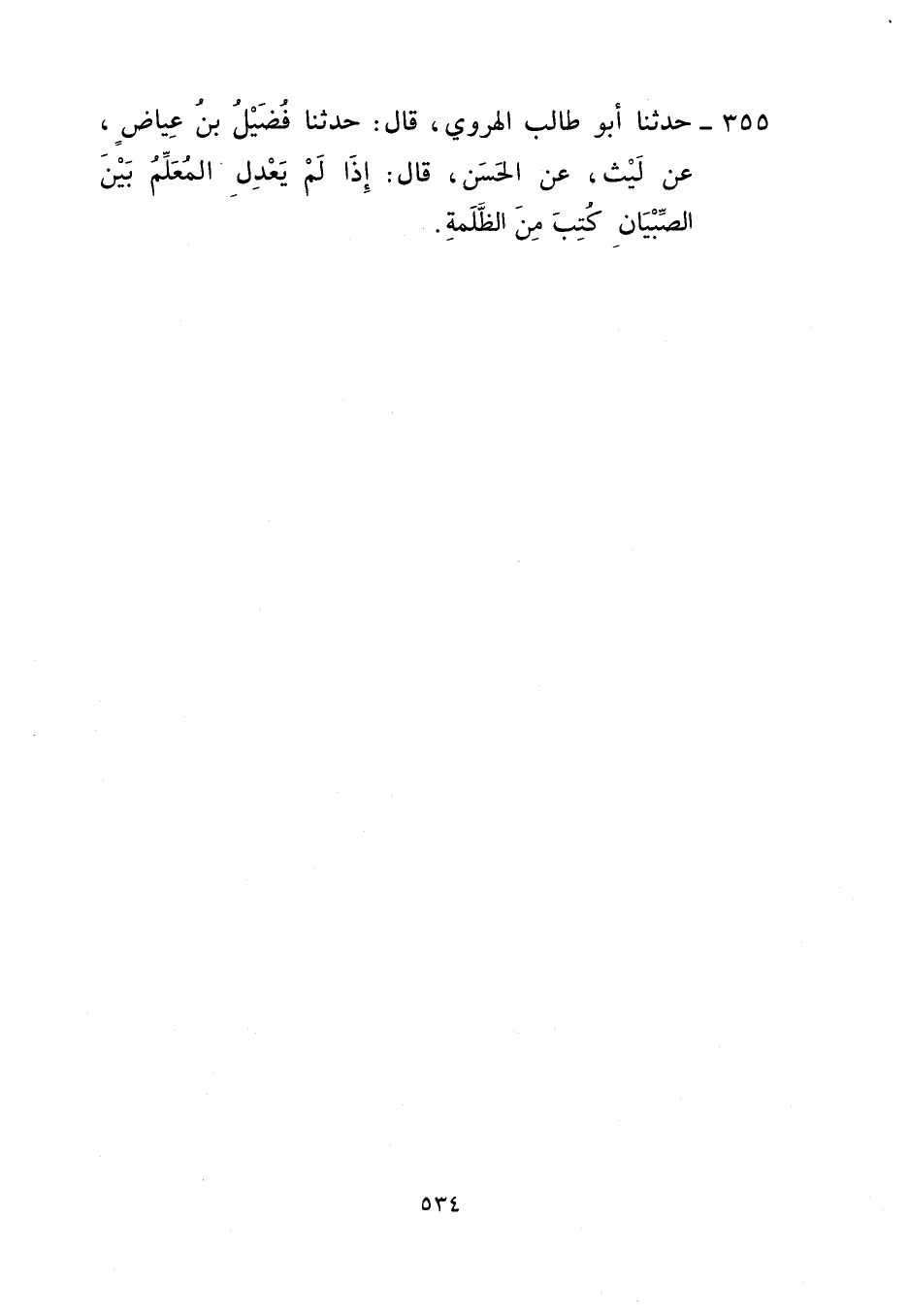 355 - حَدَّثَنَا أَبُو طَالِبٍ الْهَرَوِيُّ، قَالَ: حَدَّثَنَا فُضَيْلُ بْنُ عِيَاضٍ، عَنْ لَيْثٍ، عَنِ الْحَسَنِ، قَالَ: §إِذَا لَمْ يَعْدِلِ الْمُعَلِّمُ بَيْنَ الصِّبْيَانِ كُتِبَ مِنَ الظُّلْمَةِ