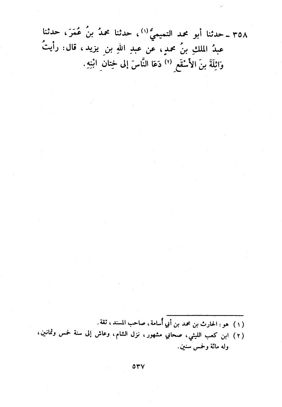 358 - حَدَّثَنَا أَبُو مُحَمَّدٍ التَّمِيمِيُّ، حَدَّثَنَا مُحَمَّدُ بْنُ عُمَرَ، حَدَّثَنَا عَبْدُ الْمَلِكِ بْنُ مُحَمَّدٍ، عَنْ عَبْدِ اللَّهِ بْنِ يَزِيدَ، قَالَ: رَأَيْتُ وَاثِلَةَ بْنَ الْأَسْقَعِ §دَعَا النَّاسَ إِلَى خِتَانِ ابْنِهِ
