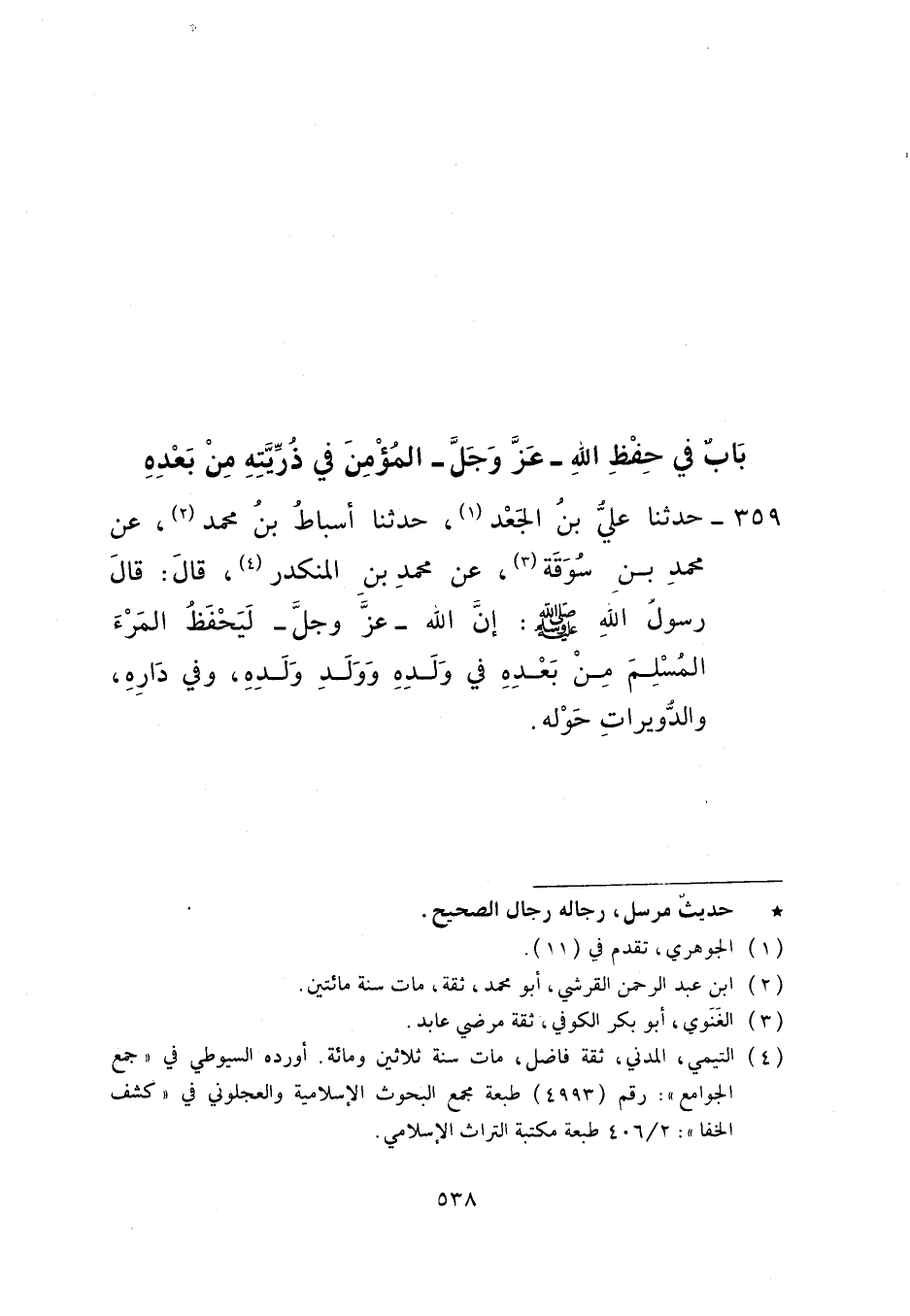 359 - حَدَّثَنَا عَلِيُّ بْنُ الْجَعْدِ، حَدَّثَنَا أَسْبَاطُ بْنُ مُحَمَّدٍ، عَنْ مُحَمَّدِ بْنِ سُوقَةَ، عَنْ مُحَمَّدِ بْنِ الْمُنْكَدِرِ، قَالَ: قَالَ رَسُولُ اللَّهِ صَلَّى اللهُ عَلَيْهِ وَسَلَّمَ: «إِنَّ اللَّهَ عَزَّ وَجَلَّ §لِيَحْفَظُ الْمَرْءَ الْمُسْلِمَ مِنْ بَعْدِهِ فِي وَلَدِهِ وَوَلَدِ وَلَدِهِ وَفِي دَارِهِ وَالدُّوَيْرَاتِ حَوْلَهُ»