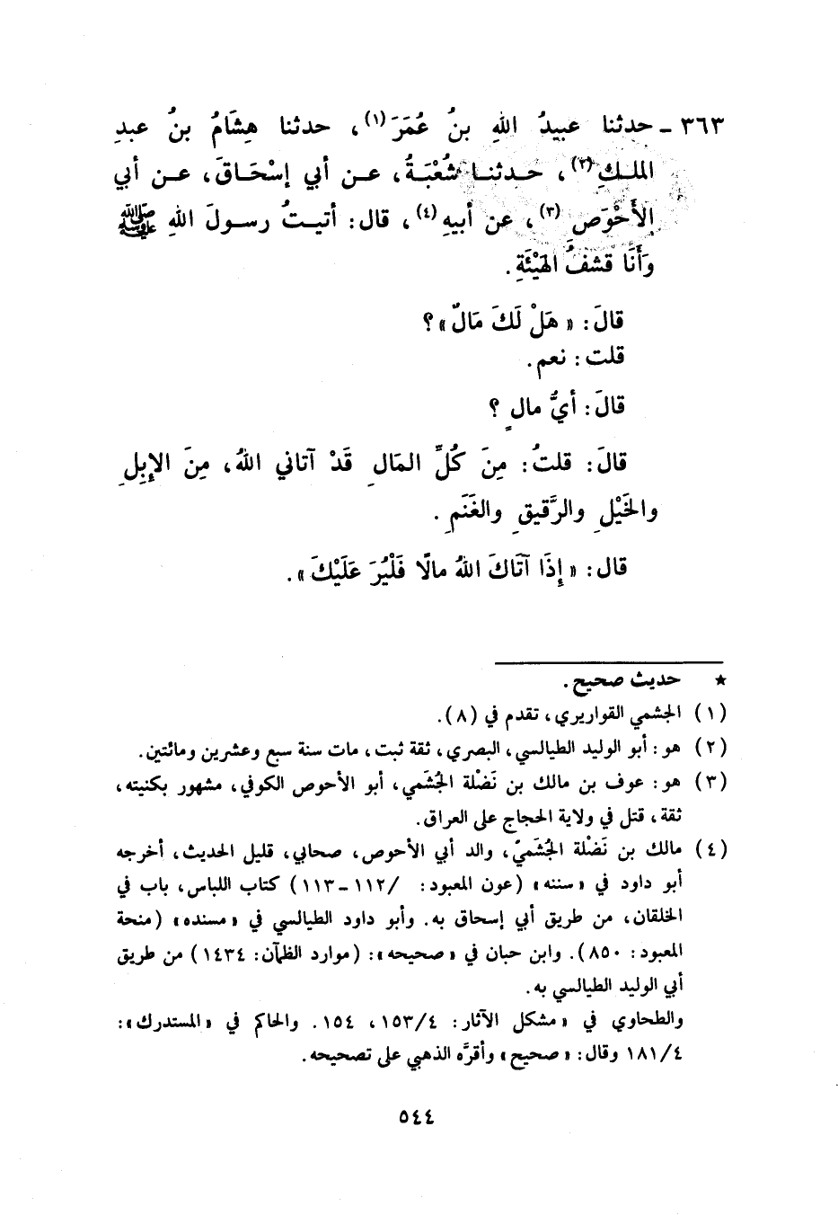 363 - حَدَّثَنَا عُبَيْدُ اللَّهِ بْنُ عُمَرَ، حَدَّثَنَا هِشَامُ بْنُ عَبْدِ الْمَلِكِ، حَدَّثَنَا شُعْبَةُ، عَنْ أَبِي إِسْحَاقَ، عَنْ أَبِي الْأَحْوَصِ، عَنْ أَبِيهِ، قَالَ: أَتَيْتُ رَسُولَ اللَّهِ صَلَّى اللهُ عَلَيْهِ وَسَلَّمَ وَأَنَا قَشِفُ الْهَيْئَةِ، قَالَ: «هَلْ لَكَ مَالٌ؟» قُلْتُ: نَعَمْ قَالَ: «أَيُّ مَالٍ؟» قَالَ: قُلْتُ: مِنْ كُلِّ الْمَالِ قَدْ آتَانِيَ اللَّهُ مِنَ الْإِبِلِ وَالْخَيْلِ وَالرَّقِيقِ وَالْغَنَمِ قَالَ: «§إِذَا آتَاكَ اللَّهُ مَالًا فَلْيُرَ عَلَيْكَ»