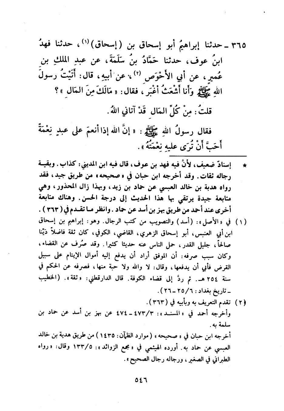 365 - حَدَّثَنَا إِبْرَاهِيمُ أَبُو إِسْحَاقَ بْنُ إِسْحَاقَ، حَدَّثَنَا فَهْدُ بْنُ عَوْفٍ، حَدَّثَنَا حَمَّادُ بْنُ سَلَمَةَ، عَنْ عَبْدِ الْمَلِكِ بْنِ عُمَيْرٍ، عَنْ أَبِي الْأَحْوَصِ، عَنْ أَبِيهِ، قَالَ: أَتَيْتُ رَسُولَ اللَّهِ صَلَّى اللهُ عَلَيْهِ وَسَلَّمَ وَأَنَا أَشْعَثُ أَغْبَرُ فَقَالَ: «مَا لَكَ مِنَ الْمَالِ؟» قُلْتُ: مِنْ كُلِّ الْمَالِ قَدْ آتَانِي اللَّهُ فَقَالَ رَسُولُ اللَّهِ صَلَّى اللهُ عَلَيْهِ وَسَلَّمَ: «إِنَّ اللَّهَ §إِذَا أَنْعَمَ عَلَى عَبْدٍ نِعْمَةً أَحَبَّ أَنْ تُرَى عَلَيْهِ نِعْمَتَهُ»