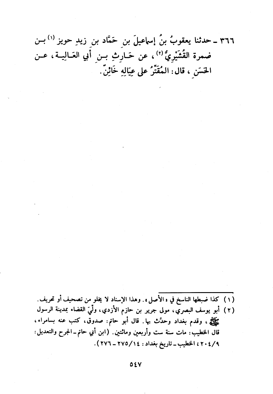 366 - حَدَّثَنَا يَعْقُوبُ بْنُ إِسْمَاعِيلَ بْنِ حَمَّادِ بْنِ زَيْدٍ، عَنْ حُوَيْزِ بْنِ ضَمْرَةَ الْقُشَيْرِيِّ، عَنْ حَارِثِ بْنِ أَبِي الْعَالِيَةِ، عَنِ الْحَسَنِ، قَالَ: §الْمُقْتِرُ عَلَى عِيَالِهِ خَائِنٌ