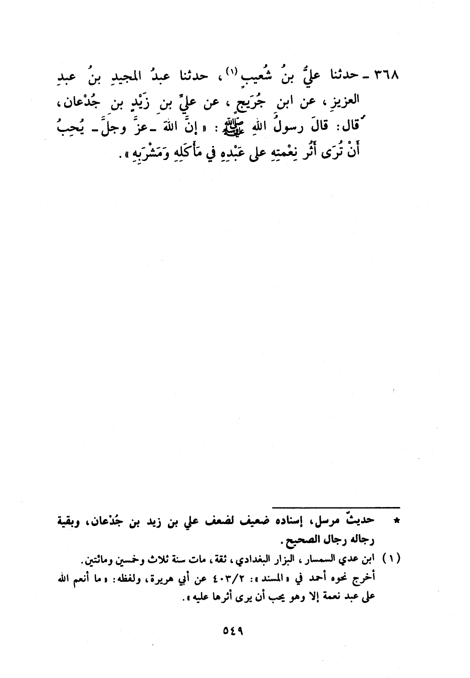 368 - حَدَّثَنَا عَلِيُّ بْنُ شُعَيْبٍ، حَدَّثَنَا عَبْدُ الْمَجِيدِ بْنُ عَبْدِ الْعَزِيزِ، عَنِ ابْنِ جُرَيْجٍ، عَنْ عَلِيِّ بْنِ زَيْدِ بْنِ جُدْعَانَ، قَالَ: قَالَ رَسُولُ اللَّهِ صَلَّى اللهُ عَلَيْهِ وَسَلَّمَ: «إِنَّ §اللَّهَ عَزَّ وَجَلَّ يُحِبُّ أَنْ تُرَى أَثَرُ نِعْمَتِهِ عَلَى عَبْدِهِ فِي مَأْكَلِهِ وَمَشْرَبِهِ»