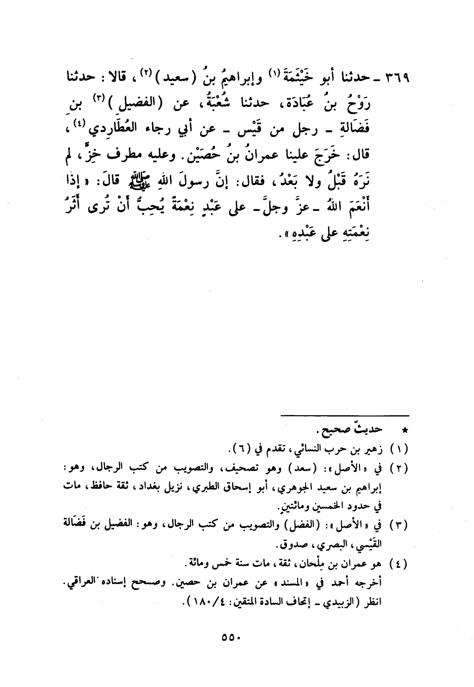 369 - حَدَّثَنَا أَبُو خَيْثَمَةَ، وَإِبْرَاهِيمُ بْنُ سَعِيدٍ، قَالَا: حَدَّثَنَا رَوْحُ بْنُ عُبَادَةَ، حَدَّثَنَا شُعْبَةُ، عَنِ الْفُضَيْلِ بْنِ فَضَالَةَ، رَجُلٌ مِنْ قَيْسٍ، عَنْ أَبِي رَجَاءٍ الْعُطَارِدِيِّ، قَالَ: خَرَجَ عَلَيْنَا عِمْرَانُ بْنُ حُصَيْنٍ وَعَلَيْهِ مُطَرِّفُ خَزٍّ لَمْ نَرَهُ قَبْلُ وَلَا بَعْدُ فَقَالَ: إِنَّ رَسُولَ اللَّهِ صَلَّى اللهُ عَلَيْهِ وَسَلَّمَ قَالَ: «§إِذَا أَنْعَمَ اللَّهُ عَزَّ وَجَلَّ عَلَى عَبْدٍ نِعْمَةً يُحِبُّ أَنْ تُرَى أَثَرُ نِعْمَتِهِ عَلَى عَبْدِهِ»