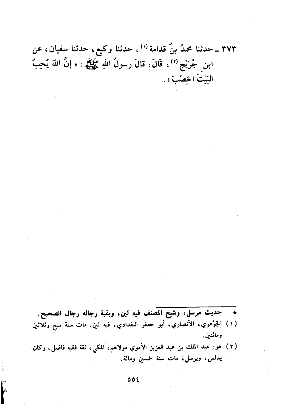 373 - حَدَّثَنَا مُحَمَّدُ بْنُ قُدَامَةَ، حَدَّثَنَا وَكِيعٌ، حَدَّثَنَا سُفْيَانُ، عَنِ ابْنِ جُرَيْجٍ، قَالَ: قَالَ رَسُولُ اللَّهِ صَلَّى اللهُ عَلَيْهِ وَسَلَّمَ: «إِنَّ اللَّهَ §يُحِبُّ الْبَيْتَ الْخِصْبَ»