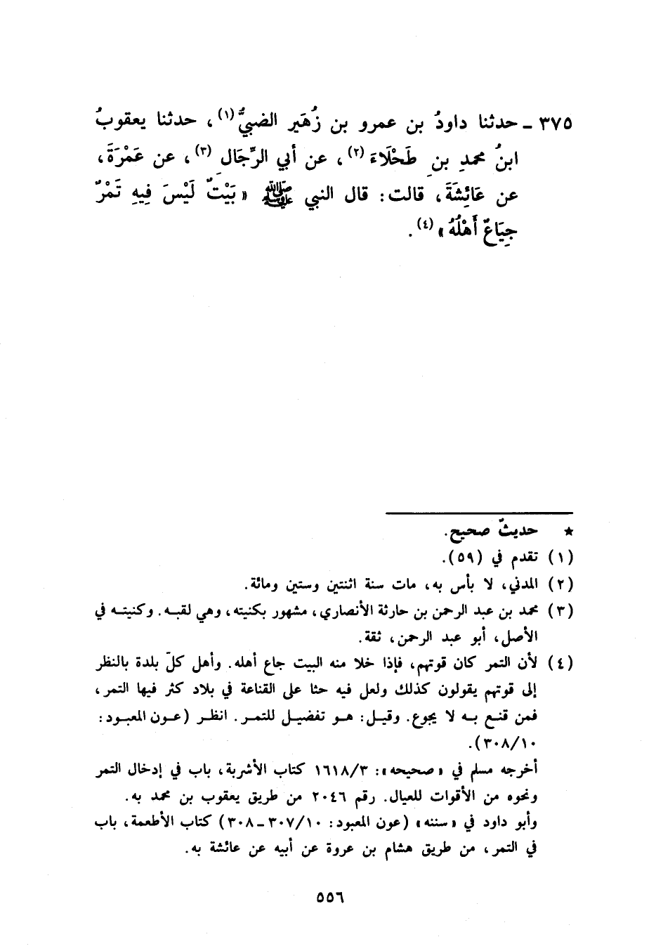 375 - حَدَّثَنَا دَاوُدُ بْنُ عَمْرِو بْنِ زُهَيْرٍ الضَّبِّيُّ، حَدَّثَنَا يَعْقُوبُ بْنُ مُحَمَّدِ بْنِ طَحْلَاءَ، عَنْ أَبِي الرِّجَالِ، عَنْ عَمْرَةَ، عَنْ عَائِشَةَ، قَالَتْ: قَالَ النَّبِيُّ صَلَّى اللهُ عَلَيْهِ وَسَلَّمَ: «§بَيْتٌ لَيْسَ فِيهِ تَمْرٌ جِيَاعٌ أَهْلُهُ»