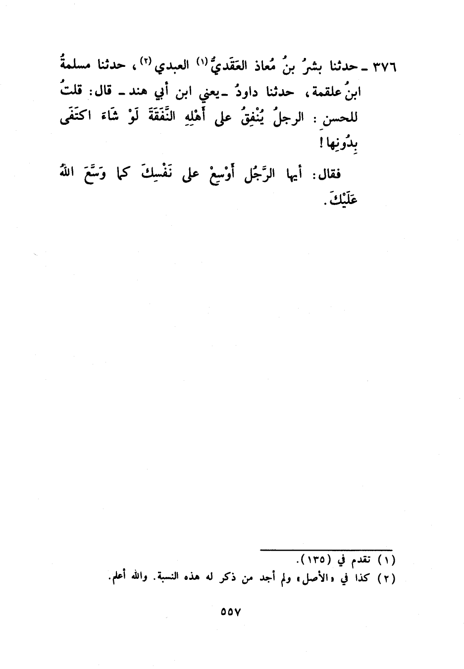 376 - حَدَّثَنَا بِشْرُ بْنُ مُعَاذٍ الْعَقَدِيُّ الْعَبْدِيُّ، حَدَّثَنَا مَسْلَمَةُ بْنُ عَلْقَمَةَ، حَدَّثَنَا دَاوُدُ يَعْنِي ابْنَ أَبِي هِنْدَ، قَالَ: قُلْتُ لِلْحَسَنِ: الرَّجُلُ يُنْفِقُ عَلَى أَهْلِهِ النَّفَقَةَ لَوْ شَاءَ اكْتَفَى بِدُونِهَا فَقَالَ: أَيُّهَا الرَّجُلُ §أَوْسِعْ عَلَى نَفْسِكَ كَمَا وَسَّعَ اللَّهُ عَلَيْكَ