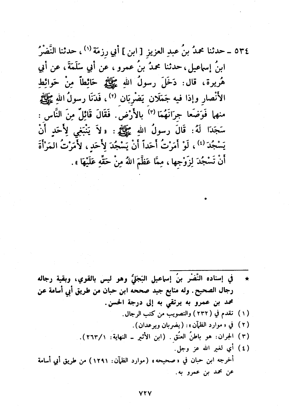 534 - حَدَّثَنَا مُحَمَّدُ بْنُ عَبْدِ الْعَزِيزِ بْنِ أَبِي رِزْمَةَ، حَدَّثَنَا النَّضْرُ بْنُ إِسْمَاعِيلَ، حَدَّثَنَا مُحَمَّدُ بْنُ عَمْرٍو، عَنْ أَبِي سَلَمَةَ، عَنْ أَبِي هُرَيْرَةَ، قَالَ: دَخَلَ رَسُولُ اللَّهِ صَلَّى اللهُ عَلَيْهِ وَسَلَّمَ حَائِطًا مِنْ حَوَائِطِ الْأَنْصَارِ وَإِذَا فِيهِ جَمَلَانِ يَضْرِبَانِ فَدَنَا رَسُولُ اللَّهِ صَلَّى اللهُ عَلَيْهِ وَسَلَّمَ مِنْهُمَا فَوَضَعَا جِرَّانَهُمَا بِالْأَرْضِ فَقَالَ قَائِلٌ مِنَ النَّاسِ سَجَدَا لَهُ قَالَ رَسُولُ اللَّهِ صَلَّى اللهُ عَلَيْهِ وَسَلَّمَ: «§لَا يَنْبَغِي لِأَحَدٍ أَنْ يَسْجُدَ، لَوْ أَمَرْتُ أَحَدًا أَنْ يَسْجُدَ لِأَحَدٍ , لَأَمَرْتُ الْمَرْأَةَ أَنْ تَسْجُدَ لِزَوْجِهَا مِمَّا عَظَّمَ اللَّهُ مِنْ حَقِّهِ عَلَيْهَا»